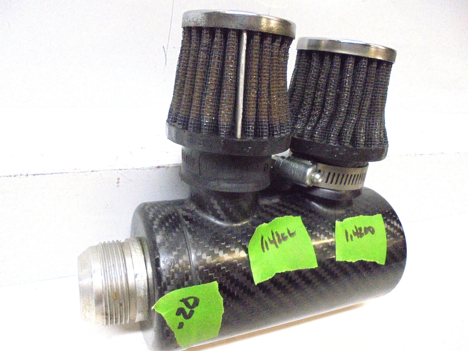 _HERE IS A NICE PREOWNED CARBON FIBER BREATHER TANK . IT MEASURES APPROX 3" OD X 7" OVERALL LENGTH . HAS (2) 1.420 " OD MALE PORTS , (1) -20 AN MALE FITTING , (2) K&N BREATHERS . YOU WILL GET THE ONE PICTURED ._ _PLEASE ADD ME TO YOUR SAVED SELLERS_ _SHIPPING COSTS CALCULATED BY BUYERS LOCATION_
