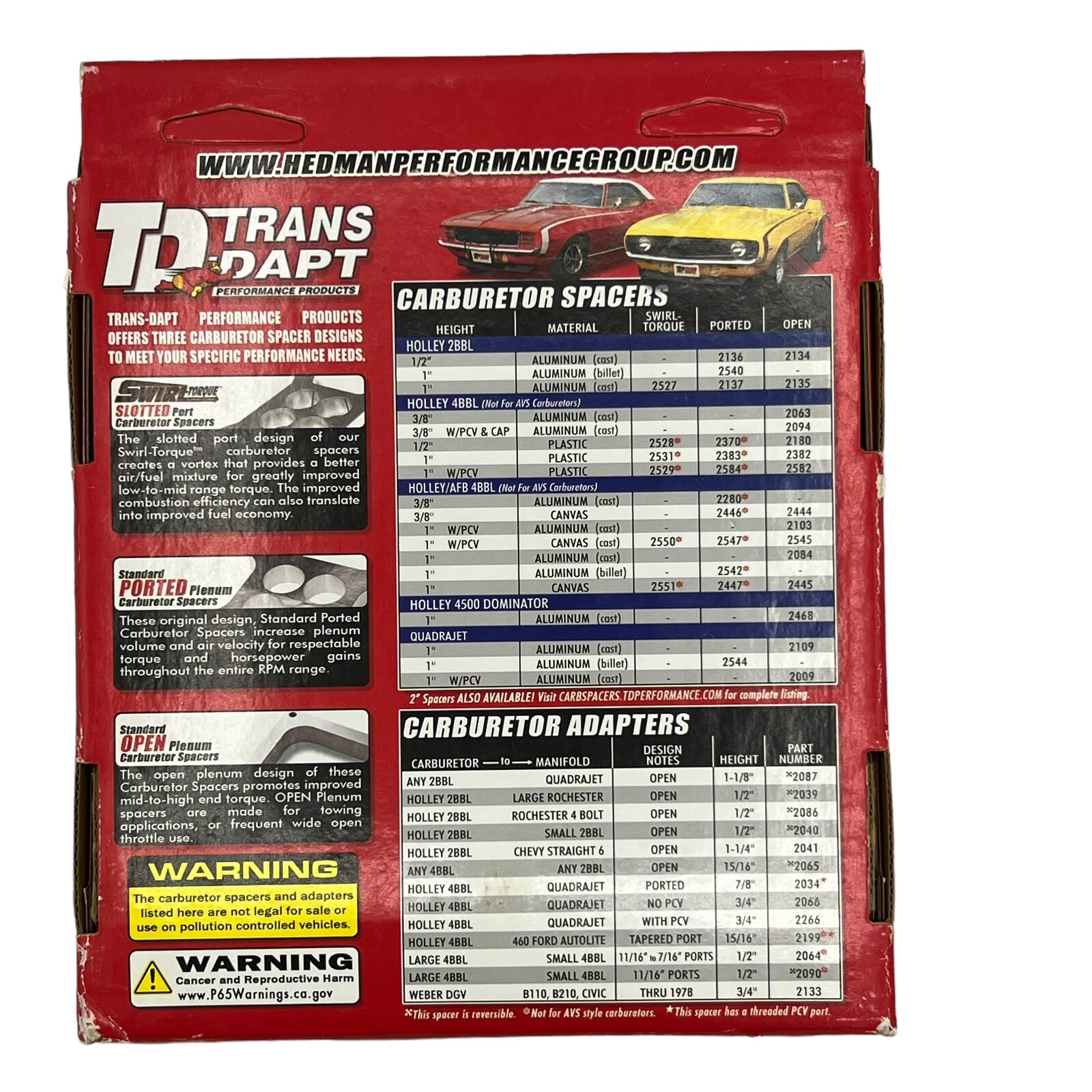 TD Trans-Dapt Performance Carburetor Spacers and Adapter 2065 New Old Stock. These are not used but New Old Stock. Never used in original open box. See Photos to see exactly what you are getting; two gaskets and spacer and hardware and stickers. Ships from a smoke-free home via USPS Priority Mail or USPS Ground Advantage or UPS. Keep in mind when making your shipping selection, UPS cannot be delivered to a P.O. Box.