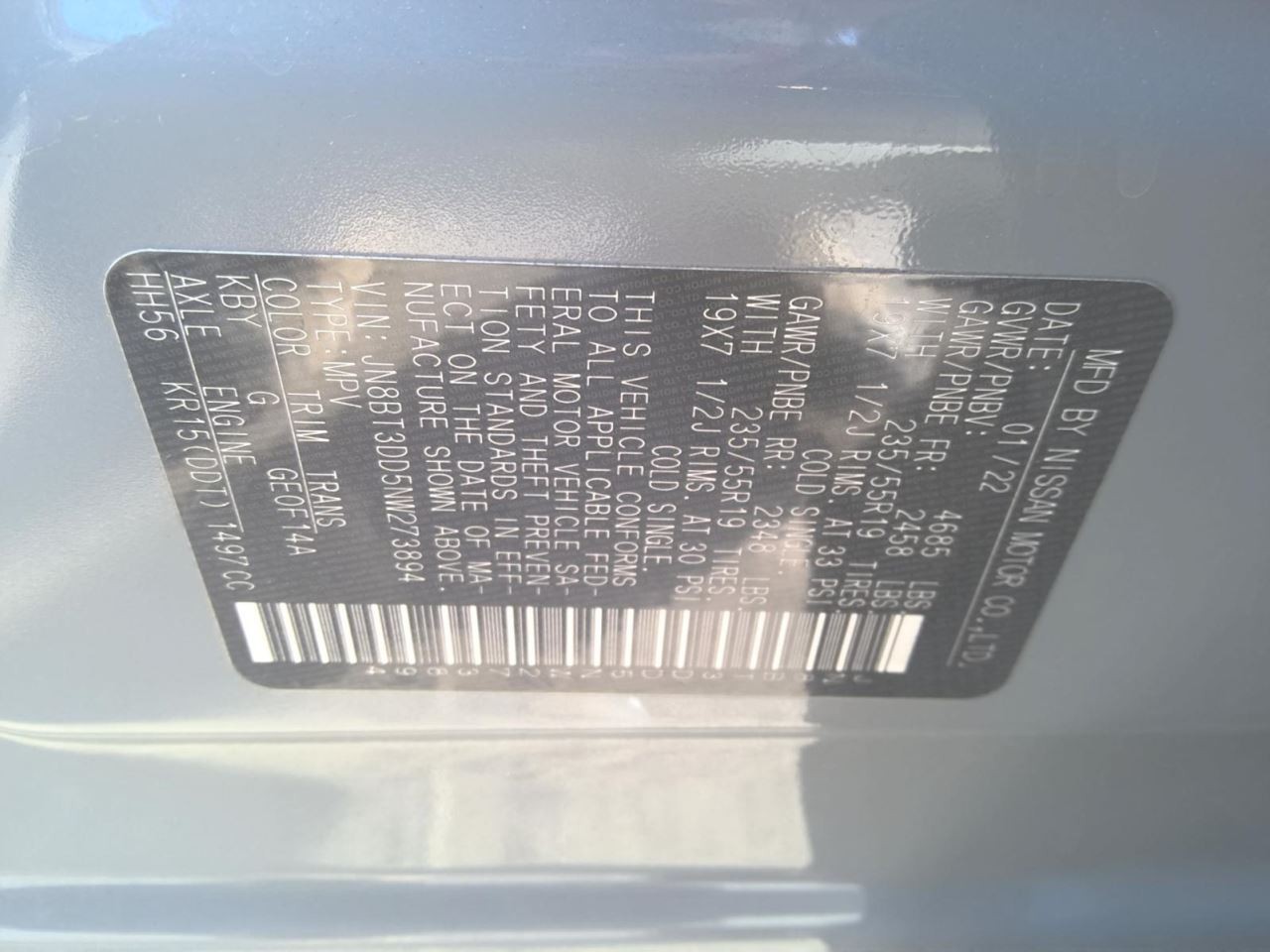 - VIN #: JN8BT3DD5NW273894