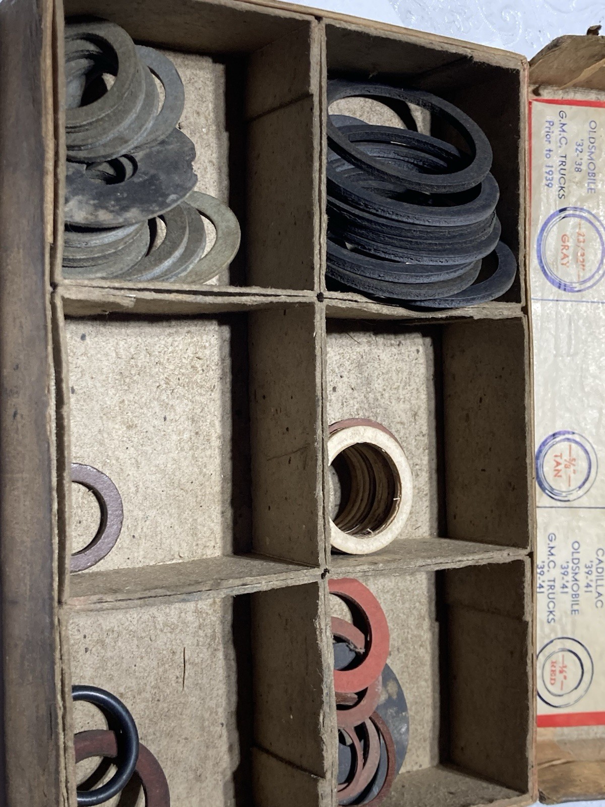 This is a box of Champ Items drain plug gaskets. It is No. 947. These gaskets are for Ford, Buick, Mercury, Packard, Chev, Studebaker, LaSalle for years mostly in the 1930's. This would be a great item for display in man cave or shop. The box shows shelf wear and grime from handling. The back flap of box is missing. Please see all pictures. Ship to US only by USPS.
