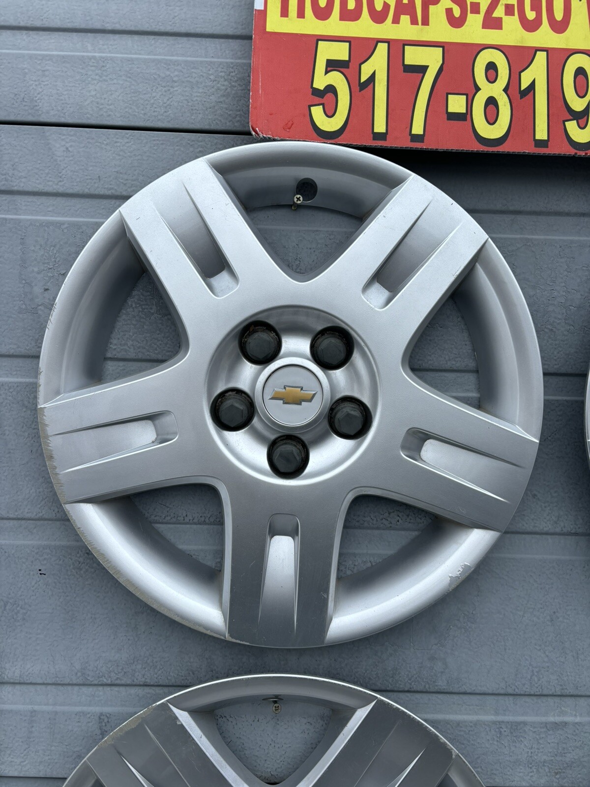 **Chevrolet Hhr /Malibu silver original used 2006-2008 Original 16” Hubcaps set of 4 Is used with scatches and curb marks, flaws , and scratches , can see scratches one cap has tiny hairline crack by a Lugnuts hole.** **Paint has flaws looks good at 2 foot.** **See pics if any. Fits original 16” Five star black steel wheel.. bolts will mount well. The hubcap may have flaws, also fit 2008 Malibu** **You must have 5 star spoke steel wheel if yours doesn’t look like that wheel it won’t fit…** **If your wheel has round hole wheel in last pic these caps will not fit your car!!!!** **this cap won’t fit !** **go to my other items for my other style hhr hubcap.** **These bolt on factory wheels only.no returns at all ..** **Have 1 set of 4 available…**