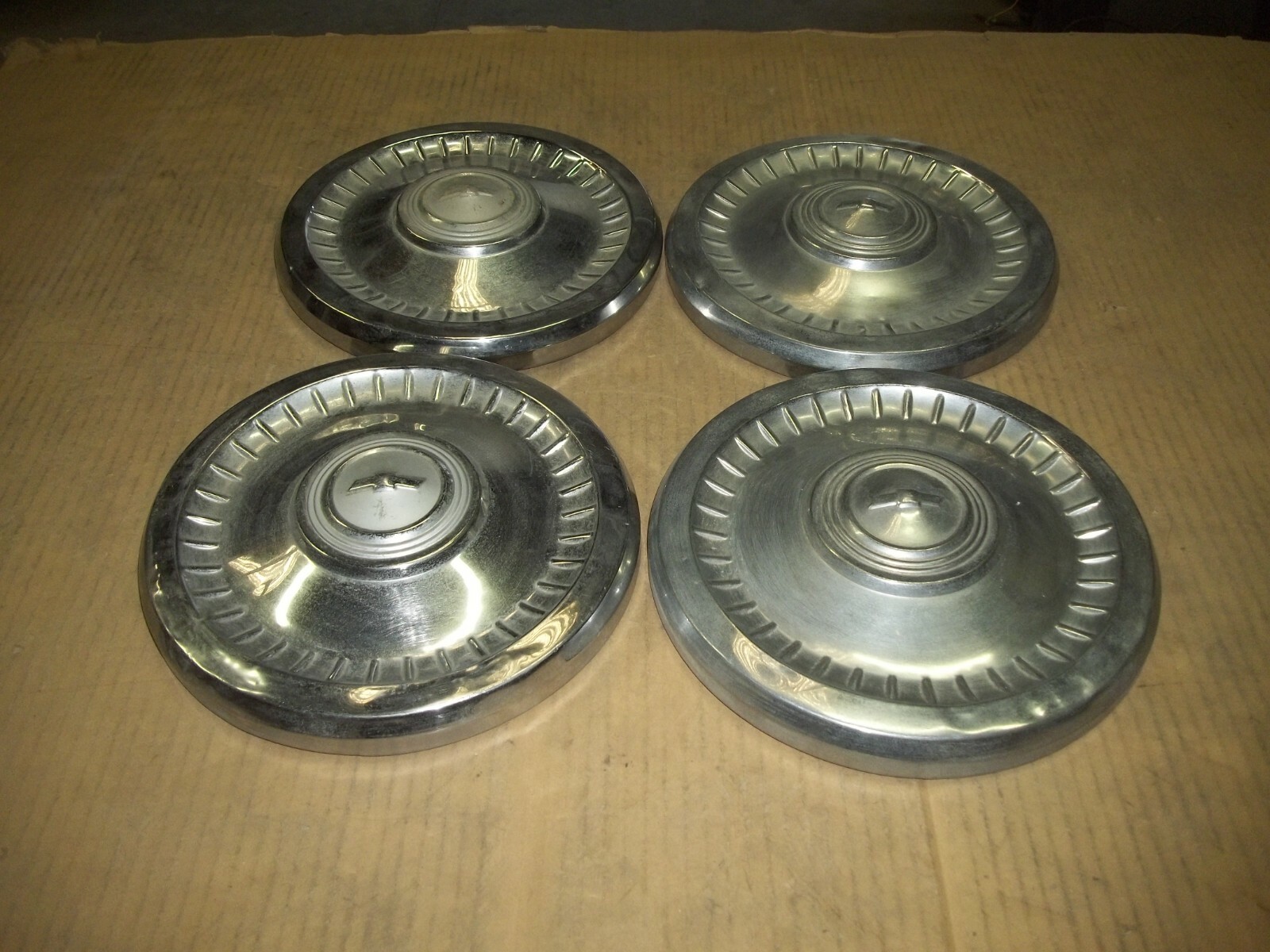 A set of FOUR (4) Chevrolet factory center hubcaps measuring about 9 1/2" across the back.Match pictures with part needed for correct replacement.This is a VERY used set with MANY deep scratches / scrapes and large dings / dents.These scratches / scrapes and dings / dents will be noticeable from even a short distance.Entire faces dinged and dented.The original finish is VERY faded and worn due to time.Paint worn off.Oxidation and corrosion.Staining that does not polish away.Pitting as pictured.Brightness or shine different shades.Bent out of round when laid flat but attach to wheels as designed.Poor driver car quality.On a scale from 1 to 10, these rate a "5" or less in condition.Buyer to pay shipping with a flat rate of $20 within the continental U.S..Elsewhere there are additional charges.Accept most methods of payment.California buyer to pay state sales tax.
