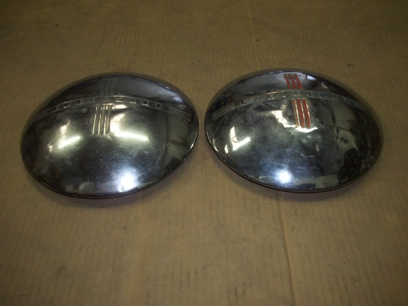A pair of TWO (2) Chevrolet factory Hubcaps measuring about 10" across the back. Center pop in hole measures about 7 9/16". MATCH pictures with style needed for correct replacement. This is a VERY used pair of two with MANY large dings / dents and deep scratches / scrapes. These dings / dents and scratches / scrapes will be noticeable from even a short distance. Entire faces have heavy curb damage with dings and dents. One hubcap has split in chrome skin as pictured. The original finish is VERY faded and worn due to time. Oxidation and corrosion. Staining that does not polish off. Pitting and surface rust as pictured. Paint worn away. Chrome skins worn thin and dull. Shine or brightness different shades. Slightly bent out of round when laid flat but attach to wheels as designed. Poor driver car quality or only better than none at all. On a scale from 1 to 10, these rate a "4" in condition. Buyer to pay shipping with a flat rate of $20 within the continental U.S.. Elsewhere there are additional charges. Accept most methods of payment. California buyer to pay state sales tax.