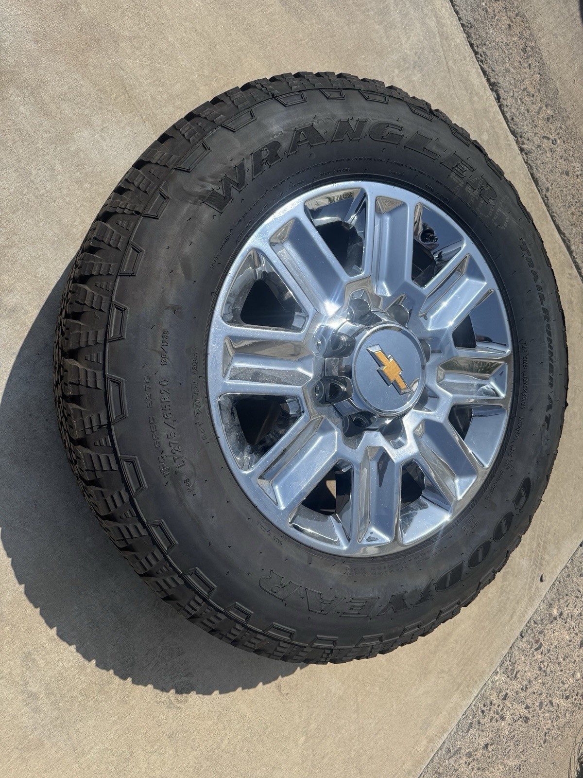 **1-2024 Chevrolet Silverado high country wheel and tire. this has the Goodyear wrangler trail master all terrian tire. 275/65/20 this was used for under 500 miles and is in very good condition. It is used so the tread shows some slight use. Please verify the pictures to make sure this will work for your exact application.** **if there is anything else I can help you with, please let me know. This item is in stock and is ready to be shipped. The wheel is in good condition as well.** **Shipping is only to the lower 48 states thank you**