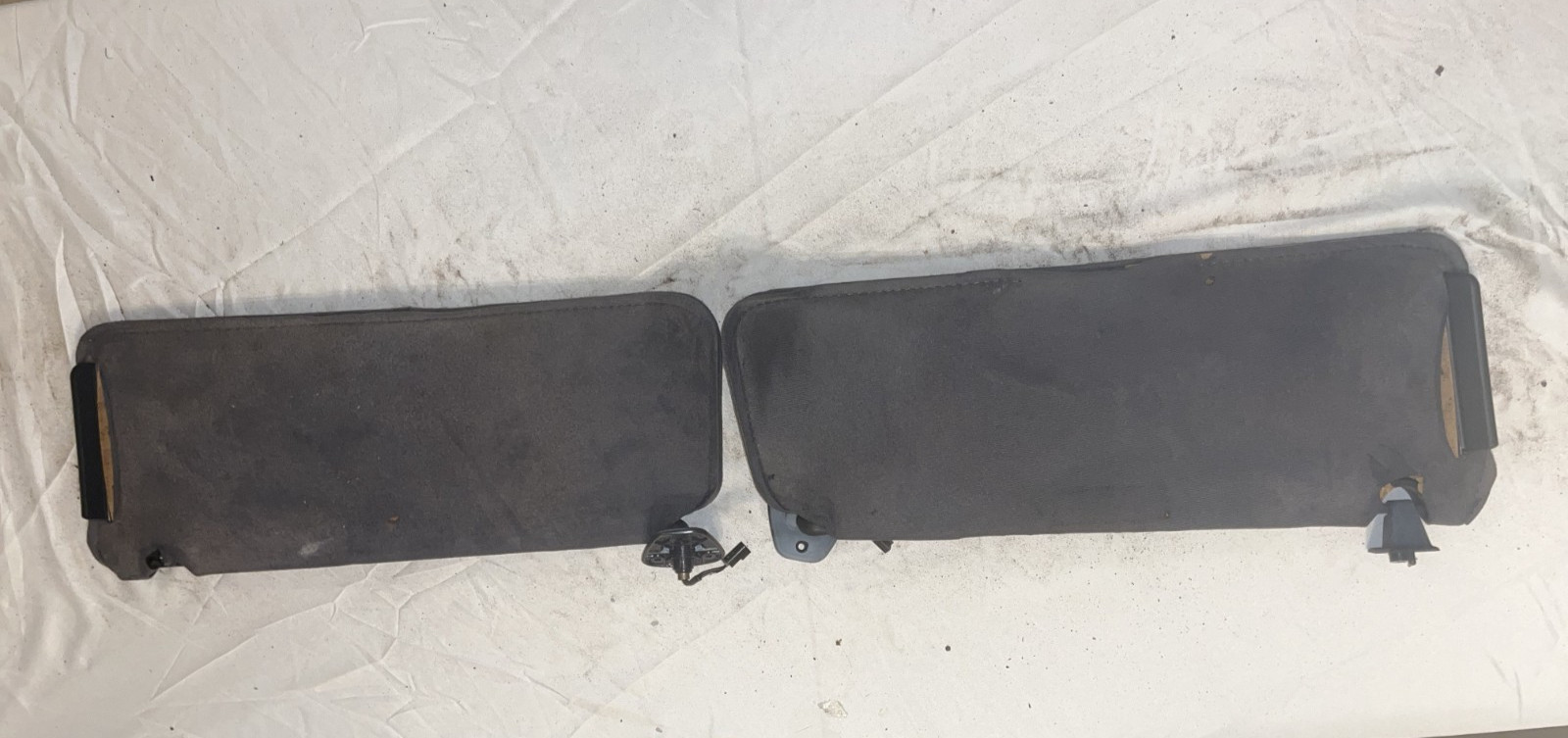CHEVY SUBURBAN/TAHOE SUNVISORS. These visors came out of a 1995 Chevy Tahoe with blue interior. They are in rough shape and will need to be reupholstered (price reflects condition). They may also need new light bulbs. Doors are attached and in good shape as are pullouts. Price includes both visors. \*\*\*NOTE: THIS IS THE OLDER STYLE-ROUND DOOR LIP AT BOTTOM OF DOOR. ALSO HAS DOUBLE PRONG PLUG. MAKE SURE YOUR VEHICLE HAS THE DOUBLE PRONG PLUG BEFORE ORDERING!!!\* (SEE PICS-NO RETURNS ON THESE ITEMS)