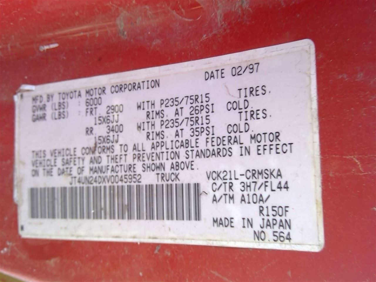 - VIN #: JT4UN24DXV0045952