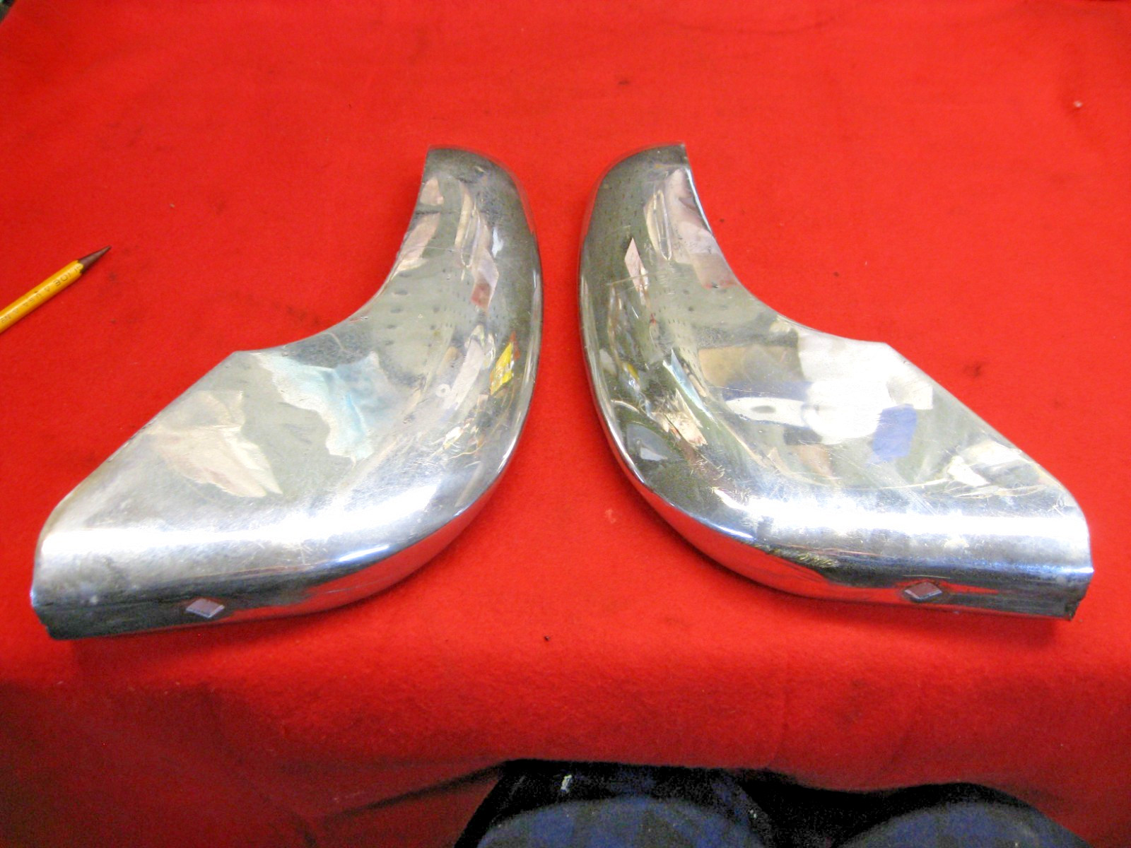 This listing is for 2 used original front bumperette's for 1953 - 1955. Parts are solid. Inside was cleaned and painted with cad. paint. Some small dents along the pointed leading edge. Holes where the tie bar screw's on are enlarged. Great cores for re chroming. Manufacturer stamps are on both of them. TABLE # 4 Shipping quote is to the lower 48 states. LOOK at my other Corvette parts in my store thanks john