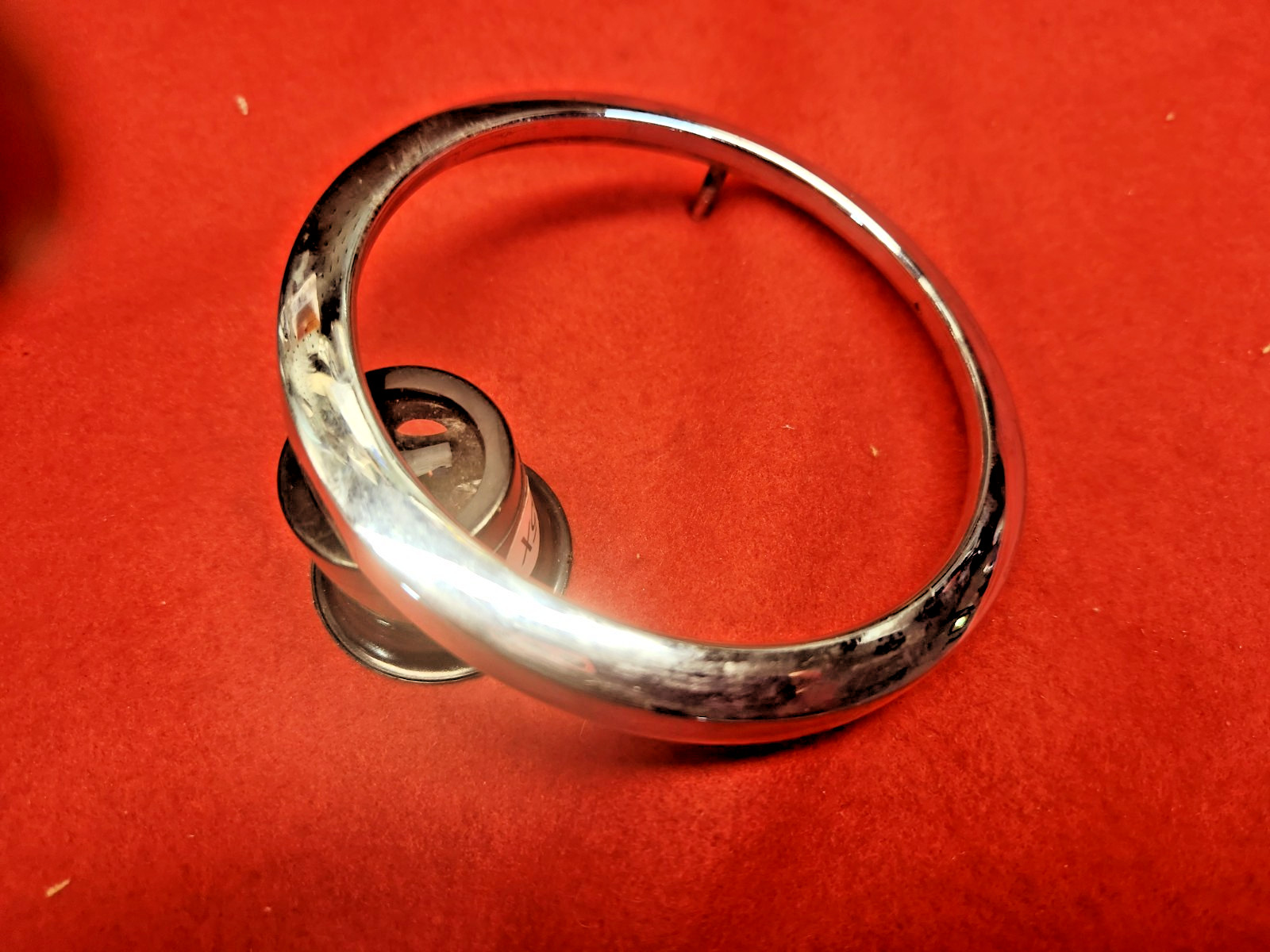 This listing is for 1 used original 1956 1957 front and rear emblem bezel. Chrome is nice. Where the pencil is pointing there is a broken mounting stud. Part would be great for a budget car. Shipping quote price is to the lower 48 states. NO INTERNATIONAL SHIPPING. LOOK at my other Corvette parts in my E BAY store thanks john Table # 3