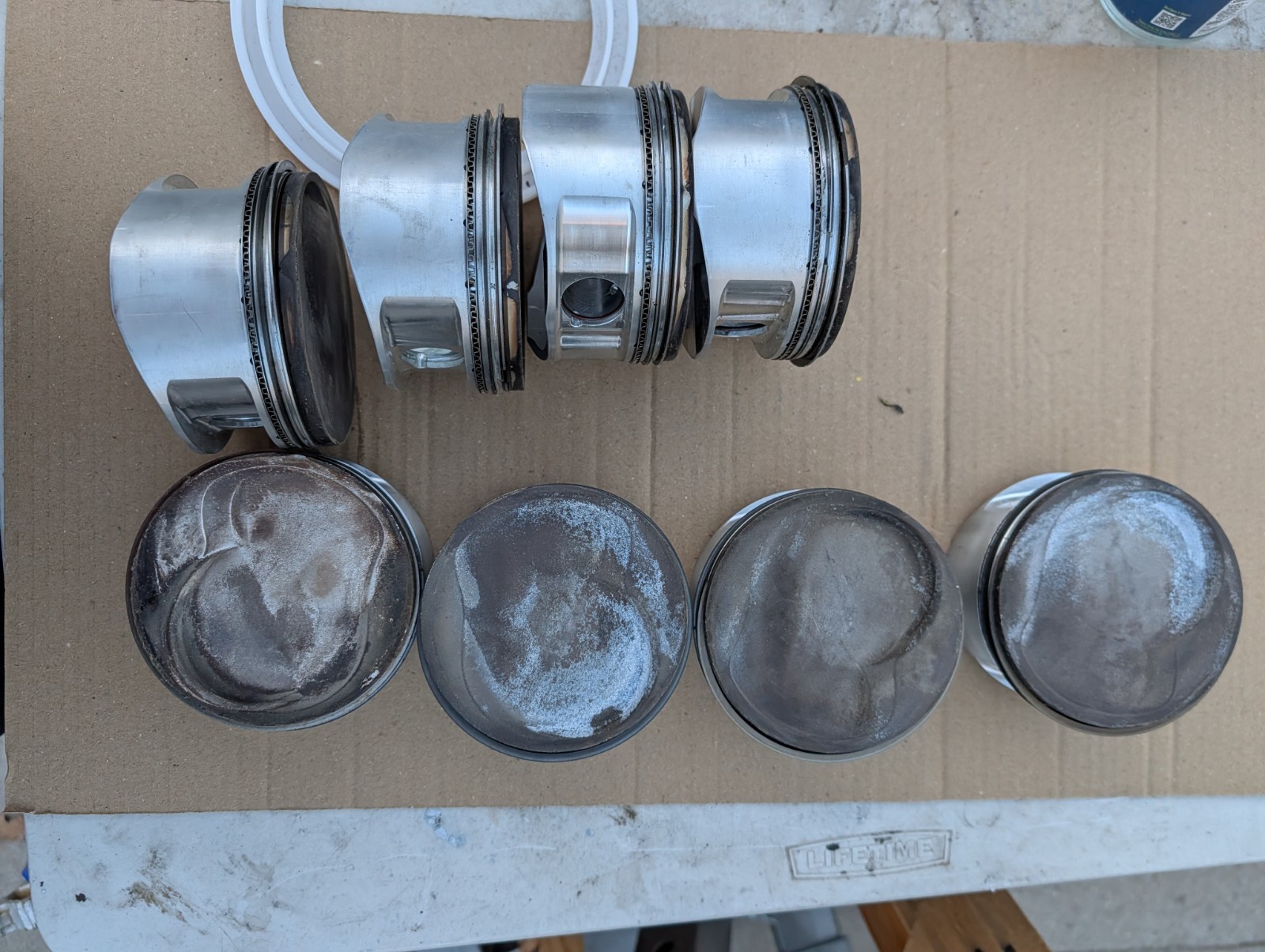 The set of pistons is used, still with rings. Rings look to be in good shape and wear on the skirts looks pretty minimal Pistons are marked 4.122