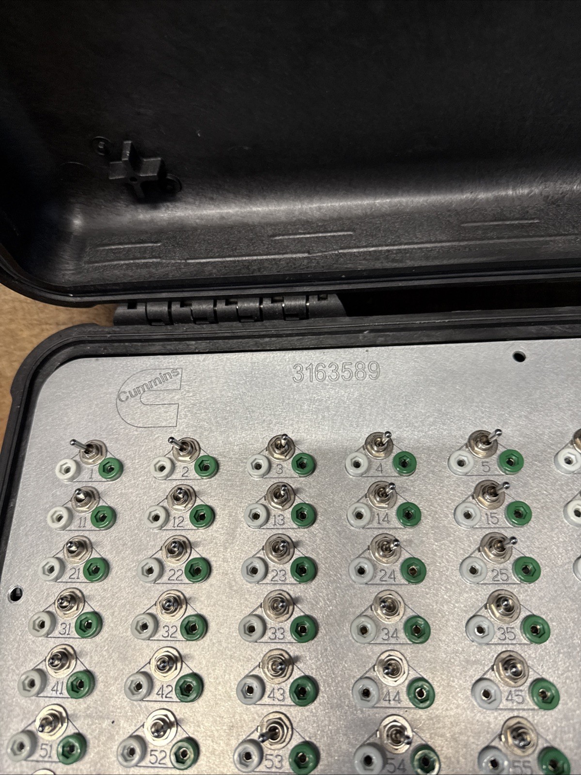 Cummins ECM breakout box, part number 3163589. This diagnostic tool is used primarily by technicians for troubleshooting and monitoring signals in Cummins diesel engine electronic control modules (ECMs). ⸻ Key Details: • Manufacturer: Cummins • Part Number: 3163589 • Purpose: Diagnostic interface to monitor signals and test inputs/outputs without disconnecting the harness • Functionality: • Provides access to individual ECM pins • Helps in pinpointing sensor, actuator, or wiring issues • Each switch corresponds to a numbered ECM pin • Warning Label: Advises referencing the proper wiring diagram to avoid ECM damage ⸻ Common Use Cases: • Used by diesel technicians, fleet mechanics, and engine calibration engineers • Compatible with Cummins engines in trucks, generators, and industrial equipment • Supports advanced troubleshooting in systems using INSITE™ diagnostic software
