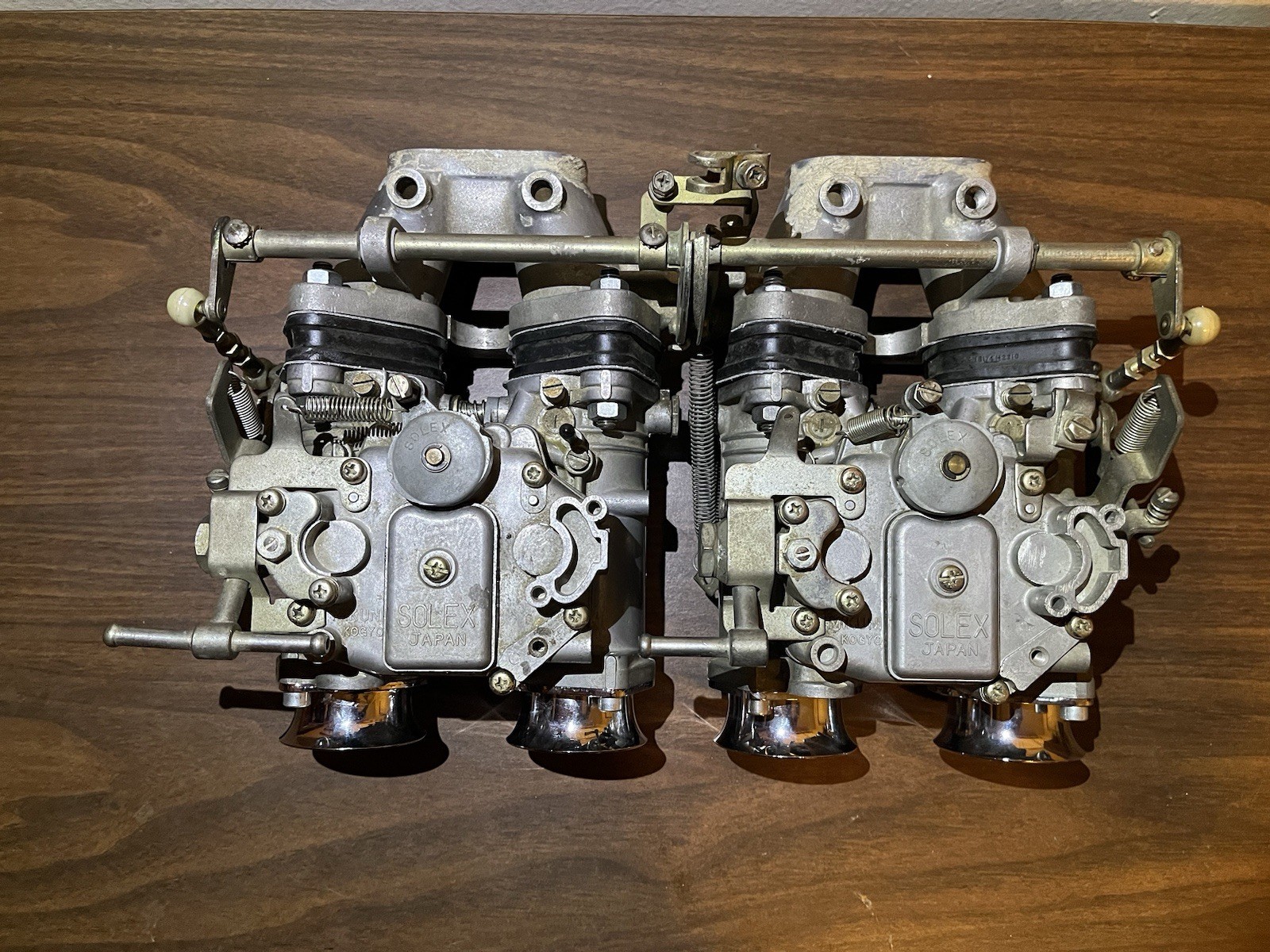 Datsun Comp A12GX Mikuni Solex Type 4 40mm WIDEBODY carb set. Setup includes new isolators, 2x rebuild kits, 25mm velocity stacks, and heat shields. Manifold head side ports have been slightly ported. No hard varnish buildup in float bowls or accel pump bodies (debris wipes off with a finger). Outer throat “inserts” are removable and have an opening of about 48mm. These have had the jet blocks and emulsion tubes converted to 44PHH type for better tuneability, thus they use 44PHH jets. Jets are as specified in the comp catalog; M120, A180, Pilot 50, 33mm chokes. Jets installed in “OA” emulsion tubes. These have been sitting for 20+ years and are in excellent rebuildable condition. Ships via FedEx with insurance of final selling value. 2101200 b210 a12
