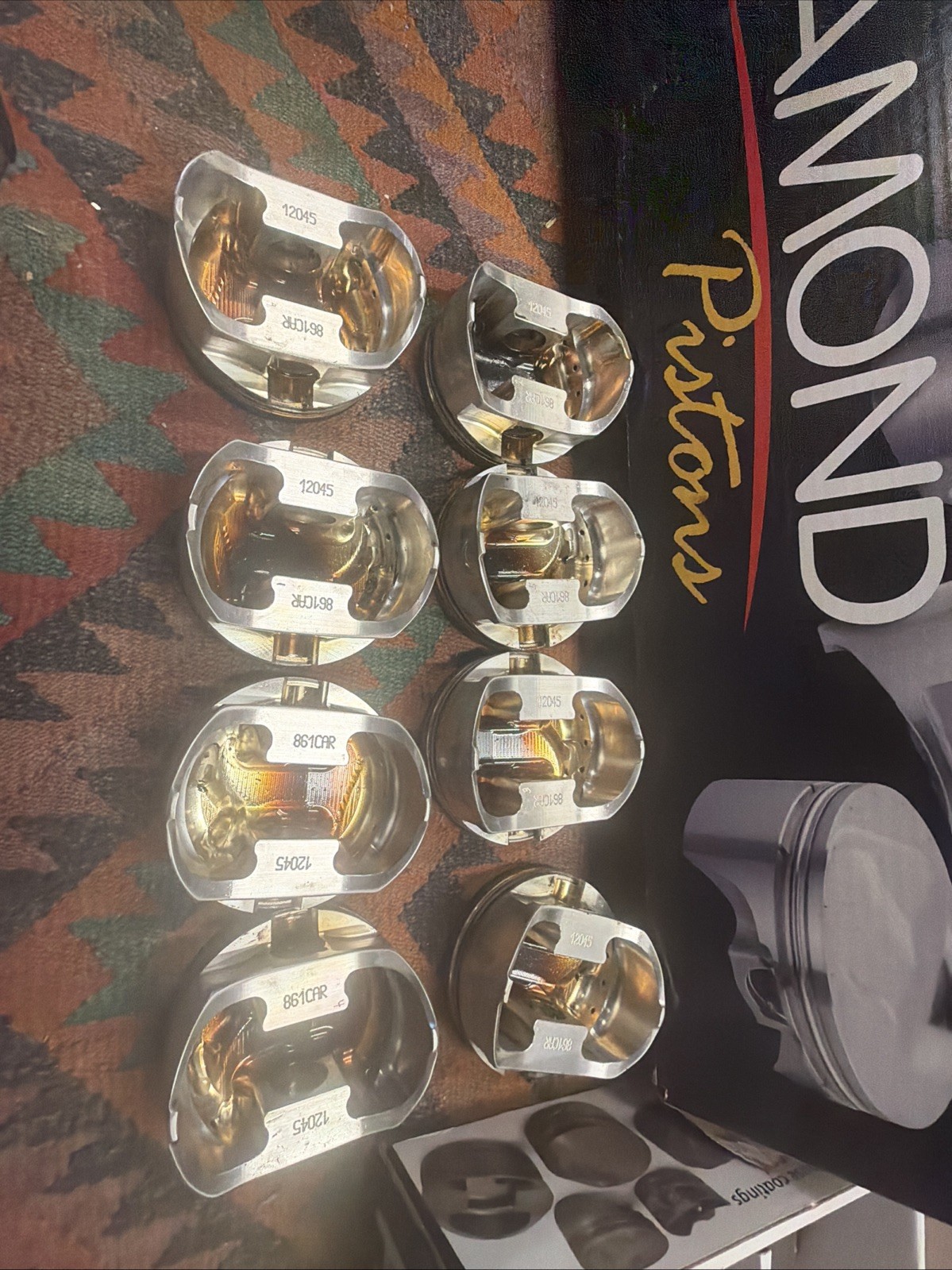 The Diamond Pistons Wide Bore 4.24 -7 Dome 437 CUI 1.063 Comp Height .927 Pin are high-quality pistons designed for performance and durability. Made by the reputable brand Diamond pistons. these pistons have been used but are in good shape and can be used again with some cleaning and a set of rings