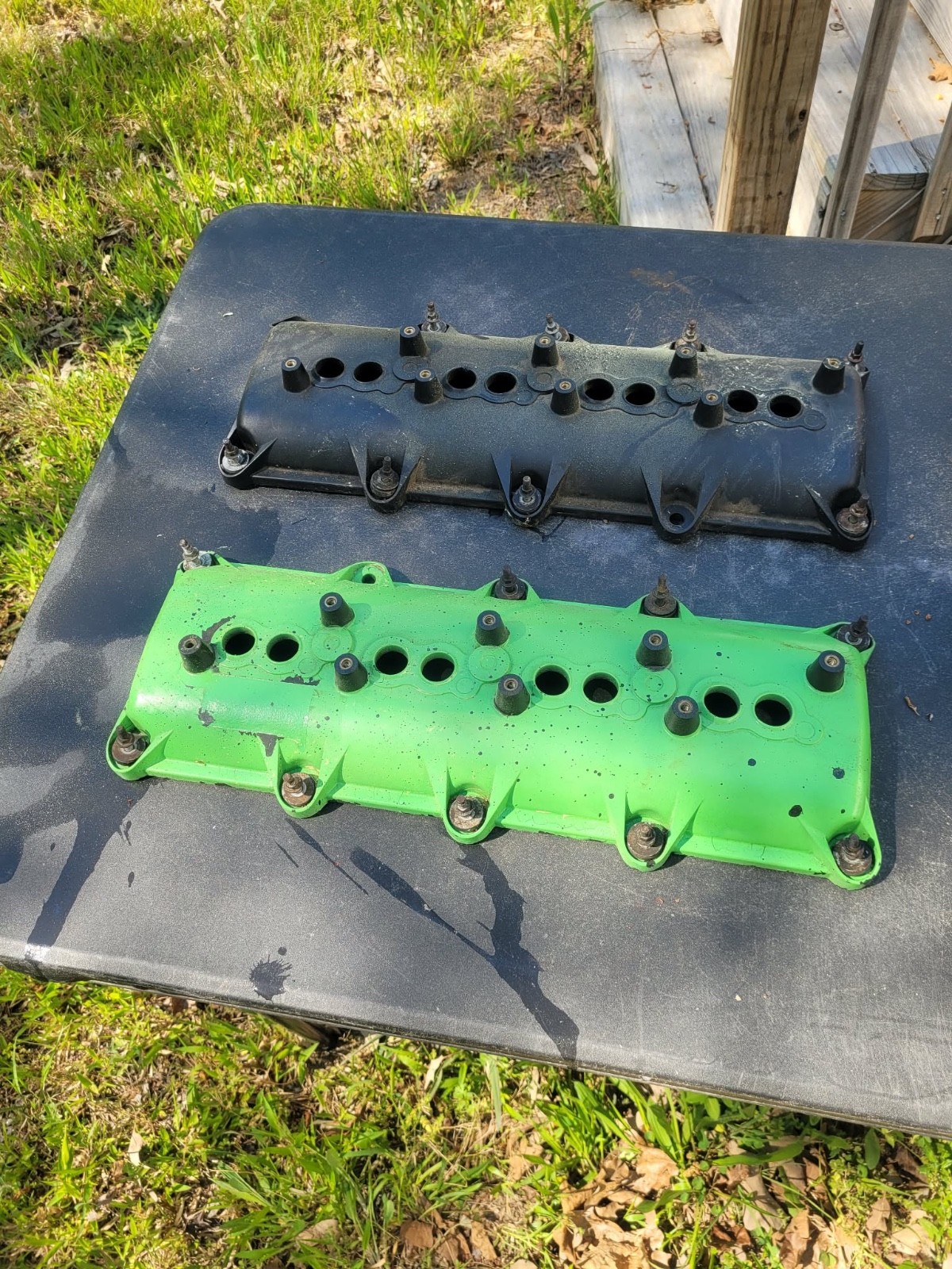 The product is a set of two used Dodge Chrysler Mopar 5.7 6.1 PRE EAGLE Hemi valve covers in black and green color. The valve covers come with mounting hardware included, making them a direct replacement for the original parts. Made of plastic, these valve covers are custom bundled and feature a painted finish. Ideal for car and truck engine parts, this Mopar brand valve cover set is suitable for vehicles with a 5.7L or 6.1L engine size, offering a reliable and quality upgrade option for engine maintenance and performance.