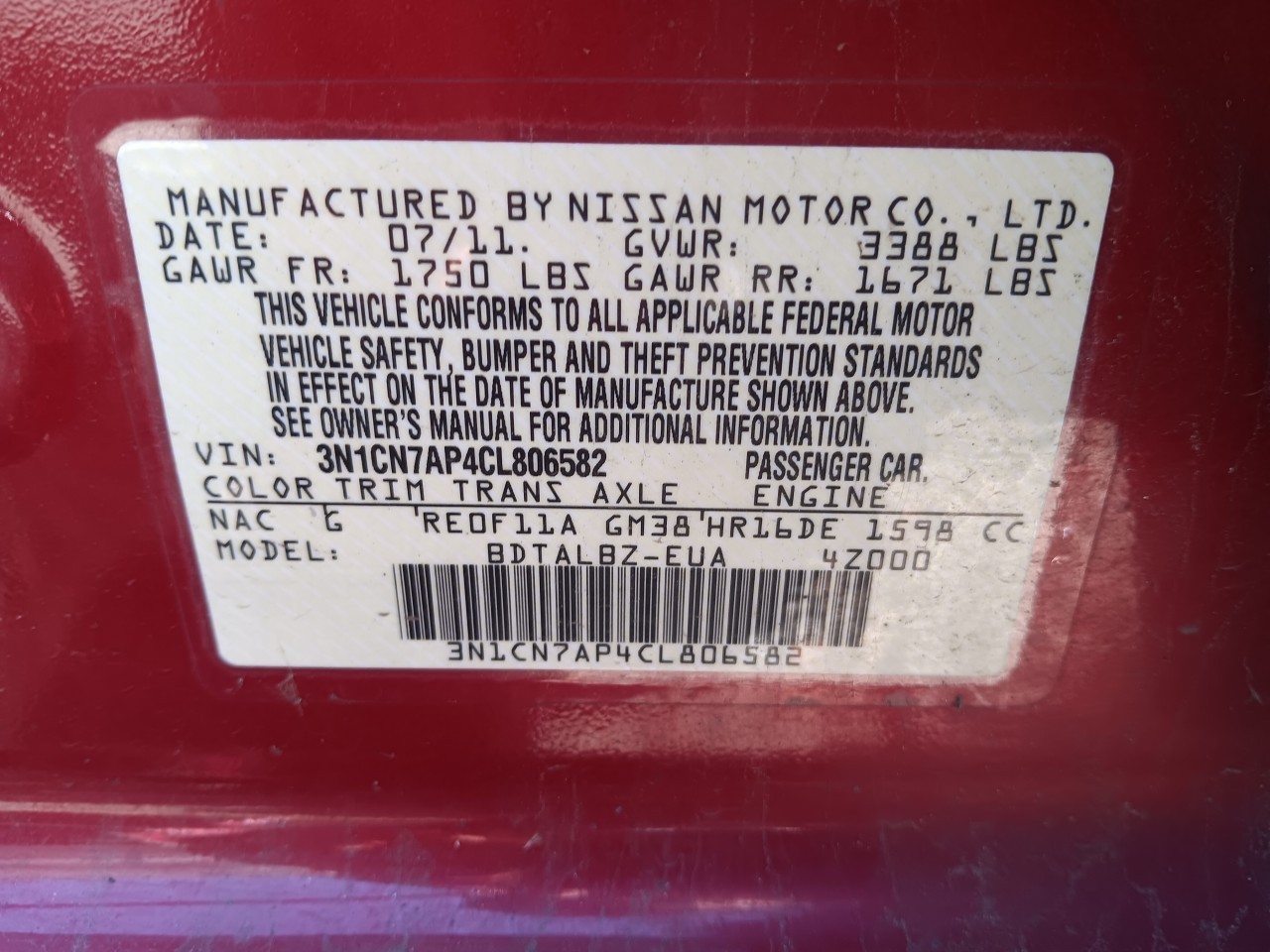 - VIN #: 3N1CN7AP4CL806582