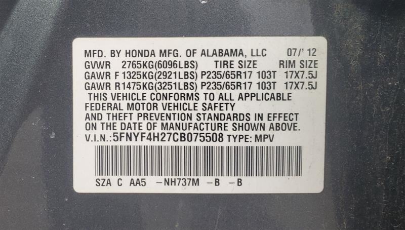 - VIN #: 5FNYF4H27CB075508