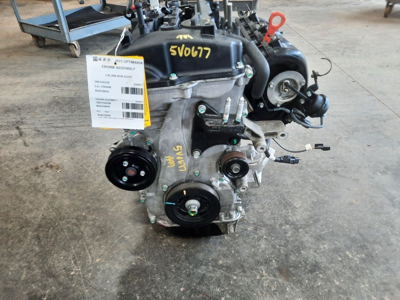 Item Description **6 MONTH WARRANTY!! 60 DAY NO HASSLE RETURNS!!** **This for a USED OEM Engine / Motor Assembly Assembly pulled from a 2015 OPTIMAKIA with 88000 actual miles on it.** **Here are our part notes about this specific part:** **2.4L,KIA REMAN MAY 2024,RAN GOOD** **Our Part #: 300-81623B, 4239042** **Our Stock#: 5V0677** Please see the fitment section below to make sure this will fit your vehicle. Pay special attention to any options listed!!! In some cases, it may only fit vehicle with certain options or specific ID#s as listed below. **OPTIMA 12-15 2.4L, VIN 7 (8th digit), Canada emissions** **OPTIMA 12-15 2.4L, VIN 7 (8th digit), Federal emissions** **SORENTO 12-13 2.4L (VIN 6, 8th digit, GDI)** Whats Included? Whats Included? FAQ/ Help Shipping Payment Returns/Warranty #### Whats Included? ``` Here is a short description of what will generally be included with your item. If you would like more information or are unsure if something will come with your item, PLEASE ASK!! A/C Compressor: Includes the clutch/pulley assembly A/C Condenser: Sensors and hoses are not included ABS Units: Include the ATTACHED electronic module unless otherwise noted Alternator: Includes the pulley. Any brackets are not included Axle/CV shaft: Does not include the axle nut Blower Motor: Include the squirrel cage/fan blade Caliper: Includes the bracket and slides. Slides are not covered under warranty Column Switch: Includes wiring (if applicable) up to the first point it can be unplugged Control Arm: Includes the ball joint and any bushings Coolant Overflow Bottle: Cap is included Cowl Vent Panel: See Our Part notes, often sold as one side only Differential Carrier: Does not include axles Door Trim Panel: Includes handle and armrest. Does not include window/lock switches Engine: Included for convenience unless otherwise noted. These parts are not covered under warranty: Intake manifold, fuel injectors, oil pan, sensors, water pump Not included: Throttle body, Turbo, wiring harness exhaust manifold (may be left on in certain cases) Exhaust Manifold: Does not include turbo where applicable Fan Assembly: Includes motors, shroud, and blades. Fuel injectors: See our part notes Fuel Filler Door: Includes hinge. Does not include bolts/hardware Fuel Pump: Includes sending unit and any molded hoses that are non-removable Headlight: Brackets are included unless otherwise noted. HID headlights include the bulbs and ballast Hub: Includes wheel studs Ignition Coil(s): See part notes Interior Rear View Mirror: Does not included bracket glued to windshield Jack: See part notes. If noted as assembly, it will include the lug wrench Mass Airflow Sensor: Does not include housing unless pictured Power Steering Pump: Includes pulley and ATTACHED reservoir. Remote reservoirs and brackets will not be included Power Steering Gear: Includes pitman arm Rack and Pinion: Includes tie rods but they are not covered under warranty Radio: Pay special attention to our fitment description. Often times radios are more than one piece and we sell them each separately Spindle/Knuckle: Does not include hub unless noted Starter: Includes solenoid Strut: Struts are left assembled and include top plate, spring, and dust boot (dust boots on used struts are rarely in perfect shape) Stabilizer Bar: Does not include links or bushings Sunvisor: Does not include clip Taillight: Pay special attention to fitment as we list the trunk lid mounted taillights as well as the corners. Does not include bulbs Temperature Control: Includes all knobs, buttons, and sliders Throttle Body: Includes sensors but they are not covered under our warranty Transmission: Automatic transmissions include torque converters and sensors. Many newer transmissions require a relearn/programming procedure. Manual transmissions do not include any part of the clutch system. Transfer Case: Does not include electric shift motor Washer Reservoir/Bottle: Includes cap unless noted Wheel/Rim: Does not include center cap, tire, or lug nuts Window Regulator: Does not include motor unless noted (most are noted with motor) Wiper Motor: Does not include arms or transmission unless noted Wiper Transmission: Does not include motor or arms unless noted ``` FAQ/ Help #### FAQ/ Help ``` Will this fit my vehicle? Is this the right part? This is the most common question that we get. The fitment information can be confusing if you don't buy replacement parts everyday. Please contact us if you are unsure!! We try to respond to questions as quickly as possible and we are more than happy to answer any questions as best as we can. In order to speed up the process, it is very helpful, but not required, for you to send us your full VIN number along with your question. It looks like its the same color as my car, how can I tell for sure? The best way is to match the manufacturer paint code. Most of the time we include the paint code in our part notes. If you don't know what a paint code is or where yours is located, please feel free to ask. We are happy to help. I only see photos of the vehicle and not the actual part you are selling. Can you send me some? Our most recent listings include actual photos when we can provide them. If you would like an actual photo, we are more than happy to take one after the purchase for your approval before the part ships. In certain cases we will take actual photos before a purchase is made. This is on a case by case basis. Send us a message and we will let you know if it is possible for us to do so I see a wheel that says it is "B" condition, what does that mean? Grading of parts is a very subjective process but we do our best to keep it uniform. Here is a brief description of wheel grades: A Condition, A-COND = This is the highest grade used wheel. It will have very minor imperfections but will be in better condition than 90% of vehicles on the road. B Condition, B-COND = This wheel will have some cosmetic imperfections. It is in average condition for the year and milea