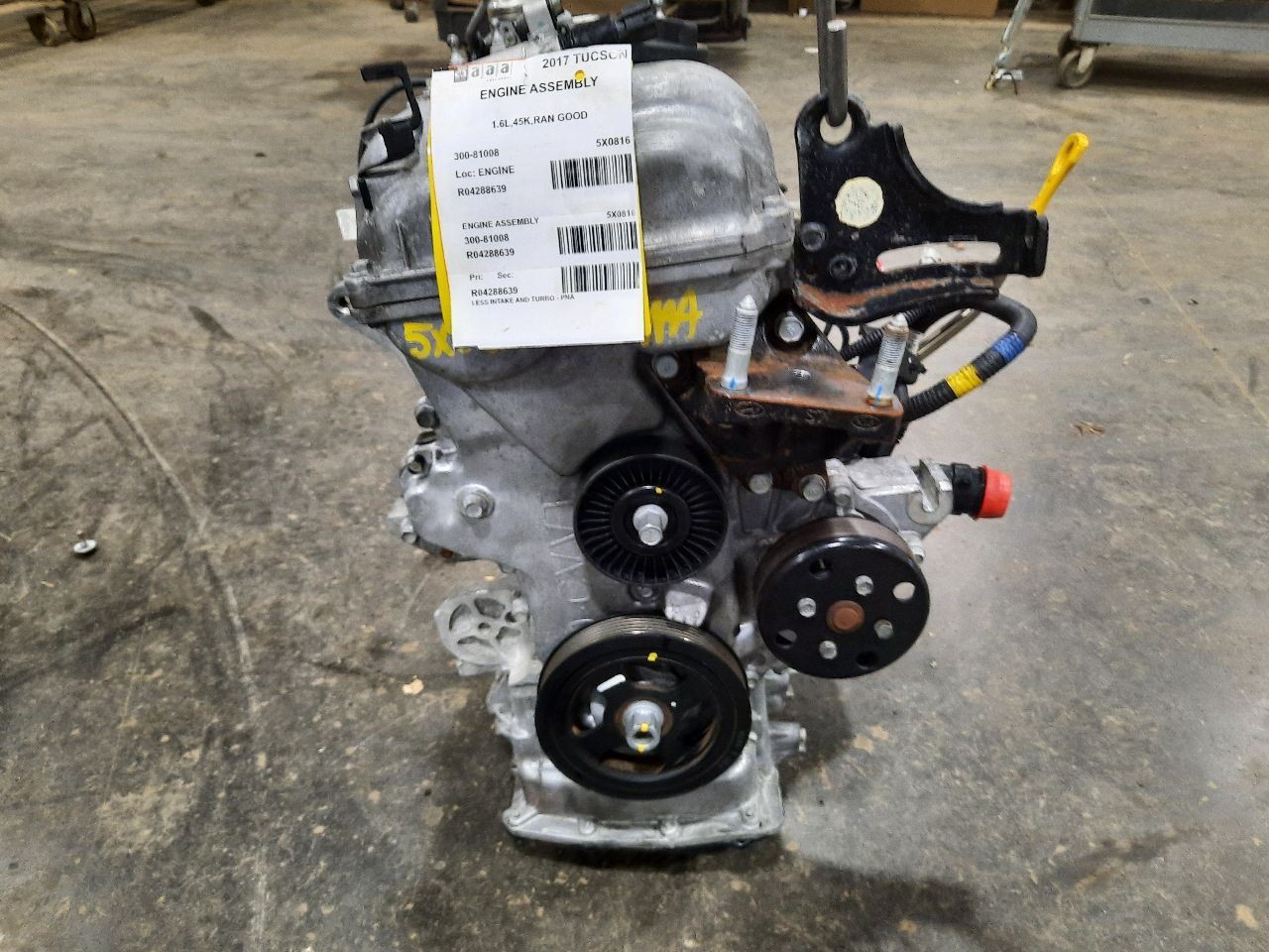 Item Description **6 MONTH WARRANTY!! 60 DAY NO HASSLE RETURNS!!** **This for a USED OEM Engine / Motor Assembly Assembly pulled from a 2017 TUCSON with 45000 actual miles on it.** **Here are our part notes about this specific part:** **1.6L,45K,RAN GOOD** **Our Part #: 300-81008, 4288639** **Our Stock#: 5X0816** Please see the fitment section below to make sure this will fit your vehicle. Pay special attention to any options listed!!! In some cases, it may only fit vehicle with certain options or specific ID#s as listed below. **TUCSON 16 gasoline, 1.6L (VIN 2, 8th digit, turbo)** **TUCSON 17-18 1.6L (VIN 2, 8th digit, turbo)** Whats Included? Whats Included? FAQ/ Help Shipping Payment Returns/Warranty #### Whats Included? ``` Here is a short description of what will generally be included with your item. If you would like more information or are unsure if something will come with your item, PLEASE ASK!! A/C Compressor: Includes the clutch/pulley assembly A/C Condenser: Sensors and hoses are not included ABS Units: Include the ATTACHED electronic module unless otherwise noted Alternator: Includes the pulley. Any brackets are not included Axle/CV shaft: Does not include the axle nut Blower Motor: Include the squirrel cage/fan blade Caliper: Includes the bracket and slides. Slides are not covered under warranty Column Switch: Includes wiring (if applicable) up to the first point it can be unplugged Control Arm: Includes the ball joint and any bushings Coolant Overflow Bottle: Cap is included Cowl Vent Panel: See Our Part notes, often sold as one side only Differential Carrier: Does not include axles Door Trim Panel: Includes handle and armrest. Does not include window/lock switches Engine: Included for convenience unless otherwise noted. These parts are not covered under warranty: Intake manifold, fuel injectors, oil pan, sensors, water pump Not included: Throttle body, Turbo, wiring harness exhaust manifold (may be left on in certain cases) Exhaust Manifold: Does not include turbo where applicable Fan Assembly: Includes motors, shroud, and blades. Fuel injectors: See our part notes Fuel Filler Door: Includes hinge. Does not include bolts/hardware Fuel Pump: Includes sending unit and any molded hoses that are non-removable Headlight: Brackets are included unless otherwise noted. HID headlights include the bulbs and ballast Hub: Includes wheel studs Ignition Coil(s): See part notes Interior Rear View Mirror: Does not included bracket glued to windshield Jack: See part notes. If noted as assembly, it will include the lug wrench Mass Airflow Sensor: Does not include housing unless pictured Power Steering Pump: Includes pulley and ATTACHED reservoir. Remote reservoirs and brackets will not be included Power Steering Gear: Includes pitman arm Rack and Pinion: Includes tie rods but they are not covered under warranty Radio: Pay special attention to our fitment description. Often times radios are more than one piece and we sell them each separately Spindle/Knuckle: Does not include hub unless noted Starter: Includes solenoid Strut: Struts are left assembled and include top plate, spring, and dust boot (dust boots on used struts are rarely in perfect shape) Stabilizer Bar: Does not include links or bushings Sunvisor: Does not include clip Taillight: Pay special attention to fitment as we list the trunk lid mounted taillights as well as the corners. Does not include bulbs Temperature Control: Includes all knobs, buttons, and sliders Throttle Body: Includes sensors but they are not covered under our warranty Transmission: Automatic transmissions include torque converters and sensors. Many newer transmissions require a relearn/programming procedure. Manual transmissions do not include any part of the clutch system. Transfer Case: Does not include electric shift motor Washer Reservoir/Bottle: Includes cap unless noted Wheel/Rim: Does not include center cap, tire, or lug nuts Window Regulator: Does not include motor unless noted (most are noted with motor) Wiper Motor: Does not include arms or transmission unless noted Wiper Transmission: Does not include motor or arms unless noted ``` FAQ/ Help #### FAQ/ Help ``` Will this fit my vehicle? Is this the right part? This is the most common question that we get. The fitment information can be confusing if you don't buy replacement parts everyday. Please contact us if you are unsure!! We try to respond to questions as quickly as possible and we are more than happy to answer any questions as best as we can. In order to speed up the process, it is very helpful, but not required, for you to send us your full VIN number along with your question. It looks like its the same color as my car, how can I tell for sure? The best way is to match the manufacturer paint code. Most of the time we include the paint code in our part notes. If you don't know what a paint code is or where yours is located, please feel free to ask. We are happy to help. I only see photos of the vehicle and not the actual part you are selling. Can you send me some? Our most recent listings include actual photos when we can provide them. If you would like an actual photo, we are more than happy to take one after the purchase for your approval before the part ships. In certain cases we will take actual photos before a purchase is made. This is on a case by case basis. Send us a message and we will let you know if it is possible for us to do so I see a wheel that says it is "B" condition, what does that mean? Grading of parts is a very subjective process but we do our best to keep it uniform. Here is a brief description of wheel grades: A Condition, A-COND = This is the highest grade used wheel. It will have very minor imperfections but will be in better condition than 90% of vehicles on the road. B Condition, B-COND = This wheel will have some cosmetic imperfections. It is in average condition for the year and mileage of the donor vehicle. It may have minor scratches and clear coat peeling. This 