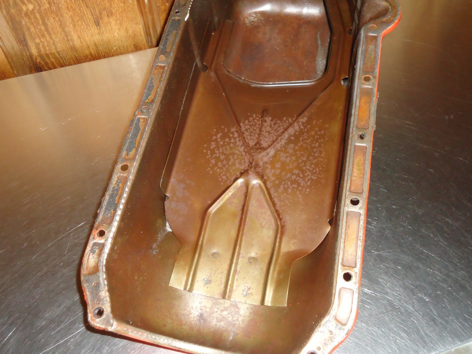 Factory OEM GM Chevy 327 350 oil pan. We are not familiar with all makes and models this fits. Please verify pictures match your application. Removed from a core engine. Pan is dirty and shows some patina from use and sitting. Bottom of pan has some small dings in it, look like hammer marks from the inside. See pics for condition. Can not be returned if installed, ran or has been modified. Must be returned in the same condition as shown.