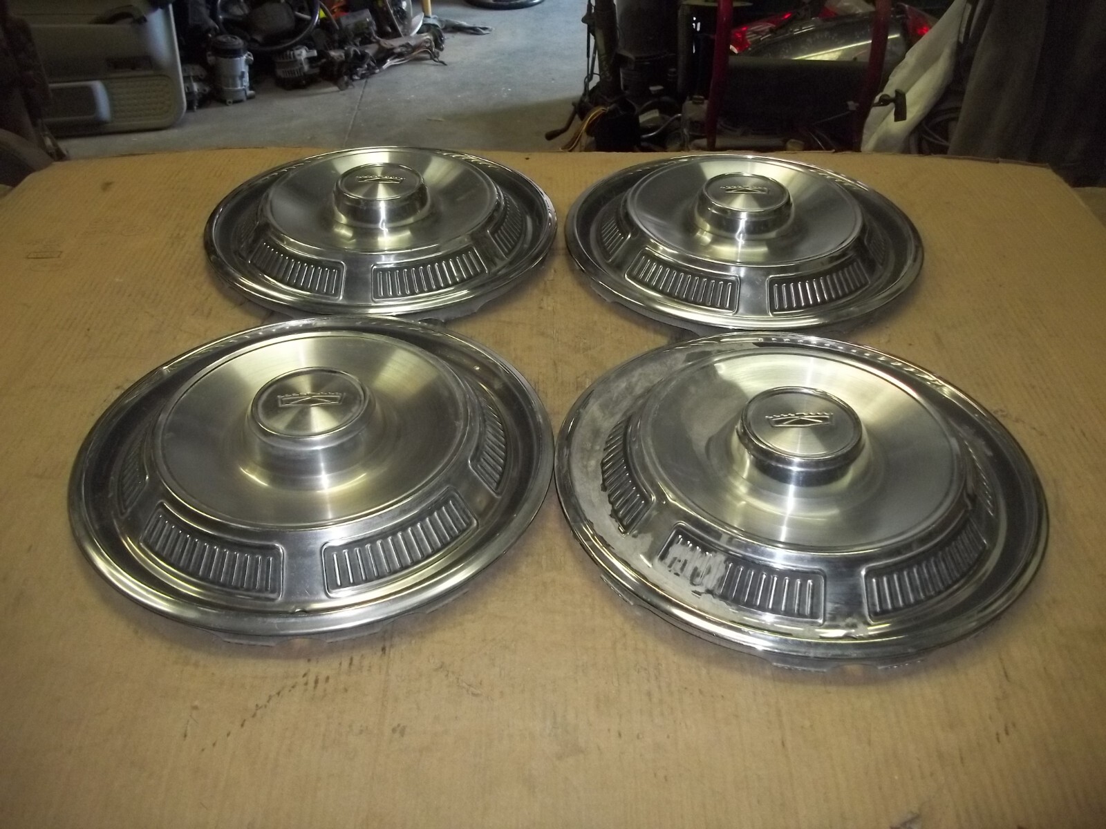 A set of FOUR (4) Ford 14" factory full wheel covers.Fit the following models listed below.This is a VERY used set with MANY large dings / dents and deep scratches / scrapes.These dings / dents and scratches / scrapes will be noticeable from even a short distance.Edges dinged and dented.Outer most sections curb damaged.The original finish is VERY faded and worn due to time.Oxidation and corrosion.Staining that does not polish off.One cover has deep acid like staining etched into metal and cannot be removed.Finish faded different shades.Poor driver car quality.On a scale from 1 to 10, these rate a "4" in condition.Buyer to pay shipping with a flat rate of $20 within the continental U.S..Elsewhere there are additional charges.Accept most methods of payment.California buyer to pay state sales tax. FIT THE FOLLOWING MODELS: 69-70 FAIRLANE 69-70 FALCON 71 TORINO