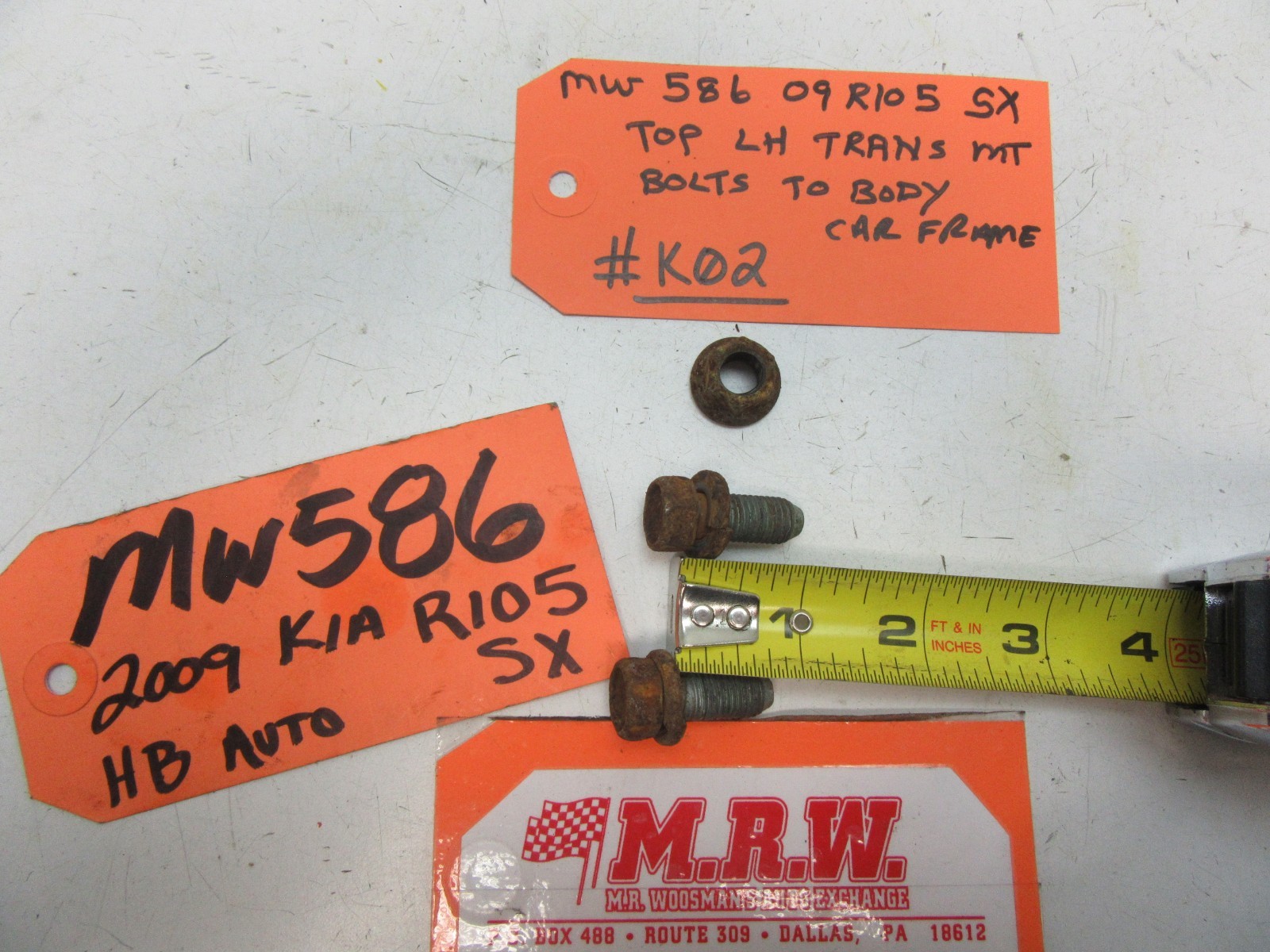 **YOU ARE LOOKING AT ONE USED** **SET OF 2 BOLTS & 1 NUT ONLY, AS SHOWN IN THE PHOTOS.** **THEY BOLT THE TOP LEFT TRANSMISSION / MOTOR MOUNT TO THE FRONT CAR FRAME.** **IT IS OUT OF A 2009 KIA RIO-5 4 DOOR HATCHBACKWITH A 1.6L 4 CYLINDER (DOHC) ENGINE WITH AUTOMATIC TRANSMISSION. EXTERIOR PAINT CODE: MIDNIGHT BLACK METALLIC** **PAINT CODE 9B; INTERIOR TRIM CODE XI. PRODUCTION DATE 08/08** **PLEASE COMPARE YOURS TO OURS IN THE PHOTOS TO BE SURE THIS IS THE ONE YOU NEED FOR YOUR VEHICLE, BEFORE YOU BUY IT.** **IT IS USED BUT IN GOOD CONDITION.** **IF YOU HAVE ANY QUESTIONS PLEASE ASK PRIOR TO BUYING. ALL SALES ARE FINAL. WE SELL EVERYTHING AS-IS, NO RETURNS. LOOK FOR MORE GREAT ITEMS IN OUR STORE. THANKS & GOOD LUCK! The free listing tool. List your items fast and easy and manage your active items.