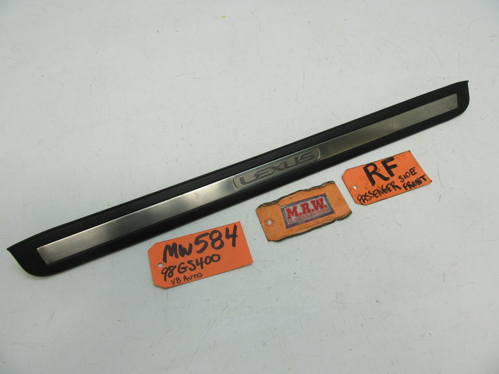**YOU ARE LOOKING AT ONE USED RIGHT (PASSENGER) FRONT MOLDING/SCUFF PLATE.** **IT IS OUT OF A 1998 LEXUS GS400 4 DOOR SEDAN WITH A1UZ-FE 4.0L 8 CYLINDER ENGINE WITH AUTOMATIC TRANSMISSION. EXTERIOR PAINT CODE:** **DIAMOND WHITE PEARL PAINT CODE 051; INTERIOR TRIM CODE LE02. PRODUCTION DATE 03/98** **IT IS USED BUT IN GOOD CONDITION.** **IF YOU HAVE ANY QUESTIONS PLEASE ASK PRIOR TO BUYING. ALL SALES ARE FINAL. WE SELL EVERYTHING AS-IS, NO RETURNS. LOOK FOR MORE GREAT ITEMS IN OUR STORE. THANKS & GOOD LUCK! The free listing tool. List your items fast and easy and manage your active items.
