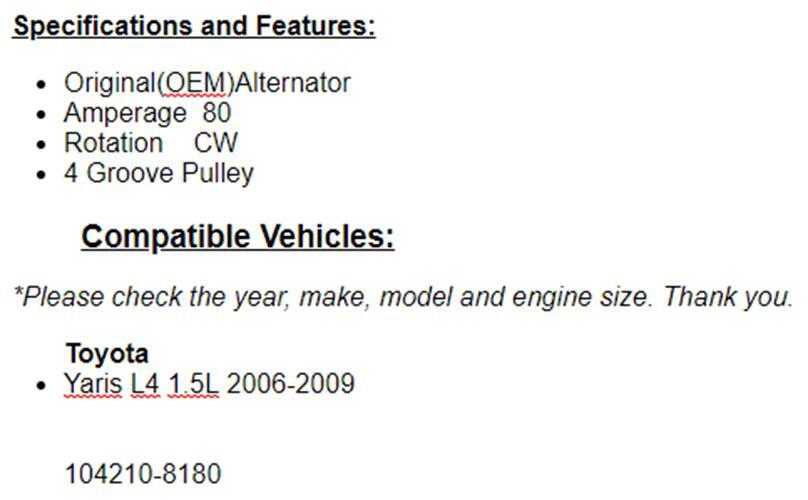 Thank you._ **Toyota** - Yaris L4 1.5L 2006-2009 104210-8180 **SUPPORT** - Pickup is available on this item, however we cannot give you the exact address or contact information until the purchase is made. You may then call us to arrange a pickup. - If you have any questions, send us a message and we will be glad to help.