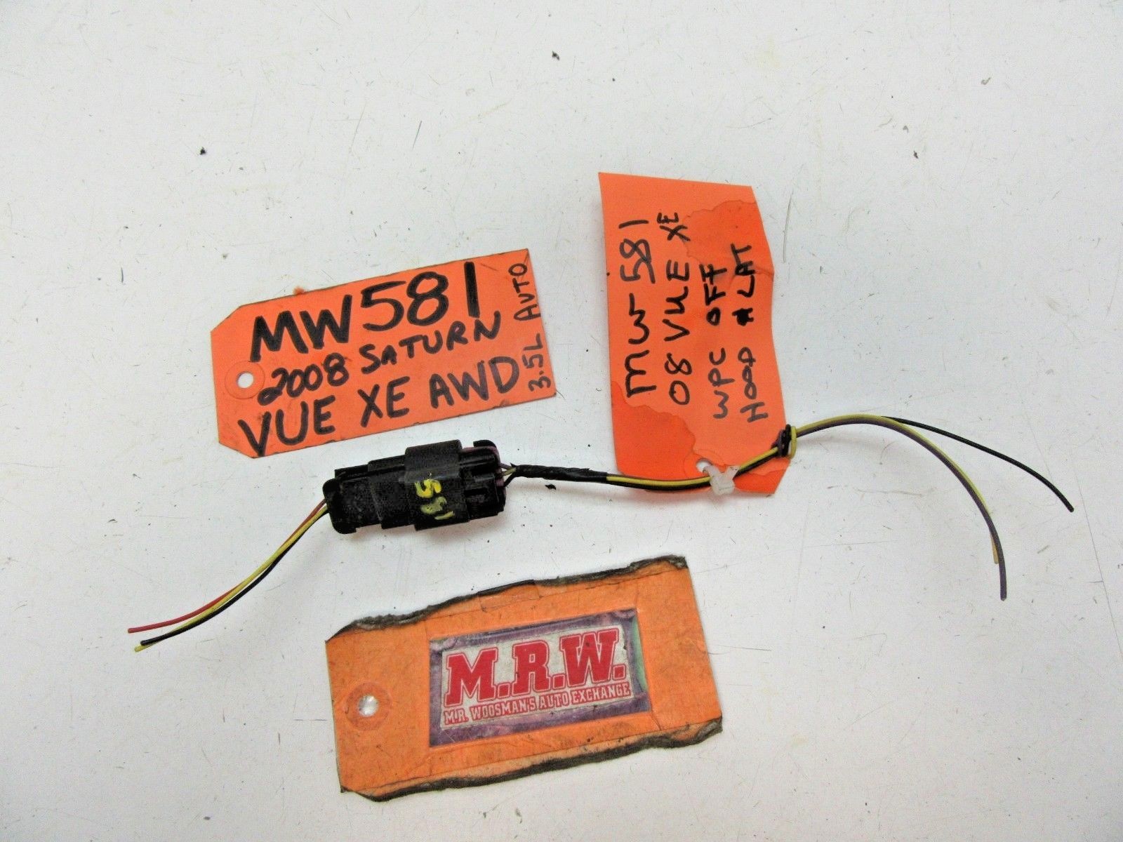 **YOU ARE LOOKING AT ONE USED WIRE & PLUG CONNECTOR ONLY, AS SHOWN IN THE PHOTOS. IT IS OFF THE HOOD LATCH.** **IT WAS CUT OFF THE BODY SIDE OF VEHICLE.** **IT IS OFF AN 2008 SATURN VUE XE, ALL WHEEL DRIVE (AWD), WITH A 3****.5L,VIN N, 8th digit, opt LZ4 AND 6 SPEED AUTOMATIC TRANSMISSION,****EXTERIOR PAINT COLOR BLACK, MFG DATE: 08/07** **IT FITS:** **CAPTIVA SPORT 12-15** **VUE 08-10** **IT IS USED BUT IN GOOD CONDITION.** **IF YOU HAVE ANY QUESTIONS PLEASE ASK PRIOR TO BUYING. ALL SALES ARE FINAL. WE SELL EVERYTHING AS-IS, WITH NO RETURNS. PLEASE LOOK FOR MORE GREAT ITEMS IN OUR STORE. THANKS MRW488. The free listing tool. List your items fast and easy and manage your active items.