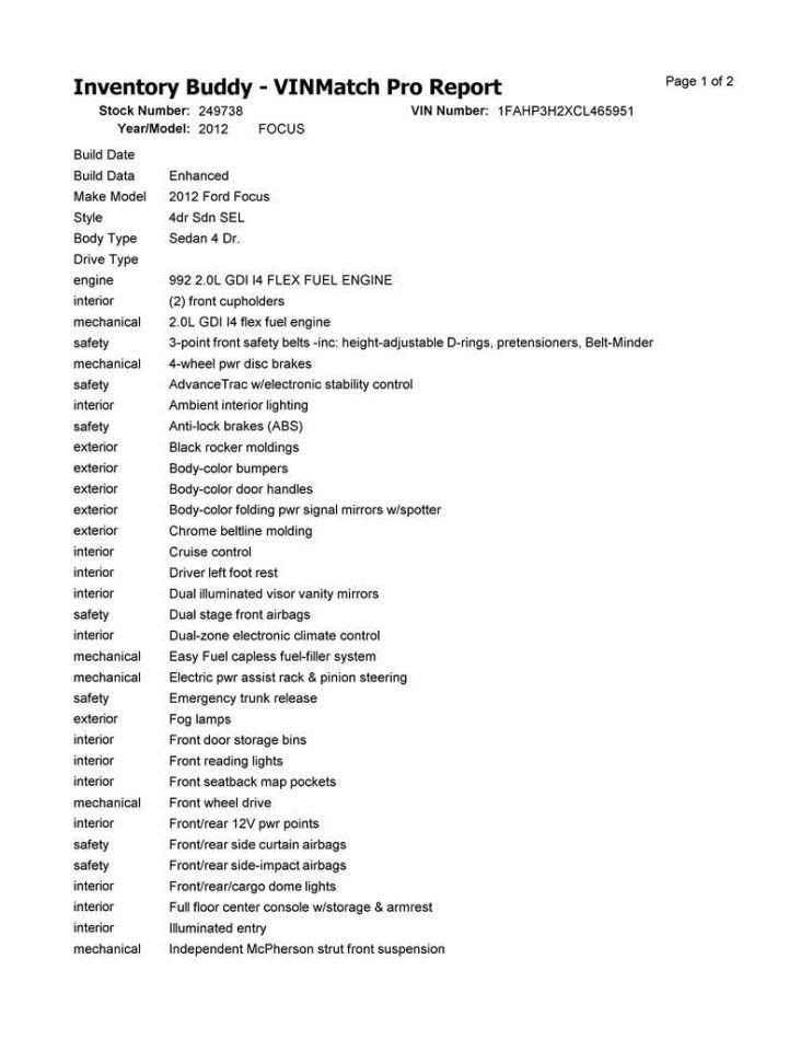 Please review the photos and fitment details carefully to verify condition, included components, and compatibility before purchase. Donor Vehicle Model : FOCUS Year : 2012 Mileage : 0 (0 = not available or unknown) Stock Number : 249738 Notes : 242.FD1G12, 2L MEDIUM LIGHT STON,AT This Part Will Fit These Makes And Models With These Options About UsPaymentShippingReturnsWarranty About Us We are happy to verify fitment for you prior to purchase via your vehicle’s VIN (Vehicle Identification Number). Please contact us with any questions prior to purchasing. Orders are sent to the shipping department throughout the day therefore we cannot guarantee adjustments to orders after payment is received. **Parts Grading** A standard code system is used to communicate the condition and quality of a part between automotive recyclers, automotive repair shops, and insurers. Knowing how these codes are used will help you understand whether the part meets your expectations before you buy it and what you can expect from the part when you receive it. **A Grade**\- The highest quality part. It is of low miles and/or exceptional condition for its age. **B Grade**\- The second level quality part. It is of average miles and normal condition for its age. **C Grade**\- The third level quality part. It has high miles and/or light damage. **No Grade**\- A part that has not yet been graded. Payment All orders must be paid in full prior to shipment. We accept credit card and cash for Local Pickup orders. If payment is not received, an Unpaid Item case will be opened for the sake of seller fee reimbursement. Shipping Items are shipped after receiving cleared payment. We ship to US addresses within the continental 48 states. Shipping to AK, HI, PO Box, APO, FPO & US Protectorates: please contact first as we may be able to arrange shipping for an additional charge (depending on the part). Freight items must have a commercial address and part fitment must be verified via VIN prior to shipment. Returns All parts must be returned in their original condition to receive full credit. Please message us with questions. Warranty All parts come with a standard warranty, please contact us for details prior to ordering. Timeframe is listed within the Warranty section of the listing for each part. Warranty claims must be made with our warranty department, details will be included with the packing slip for each order. Labor and costs associated with part installation are not included in the warranty, parts only.   Copyright © 2022, All Rights Reserved. Copyright © 2022, All rights reserved. Design & Developed By : eFusionWorld