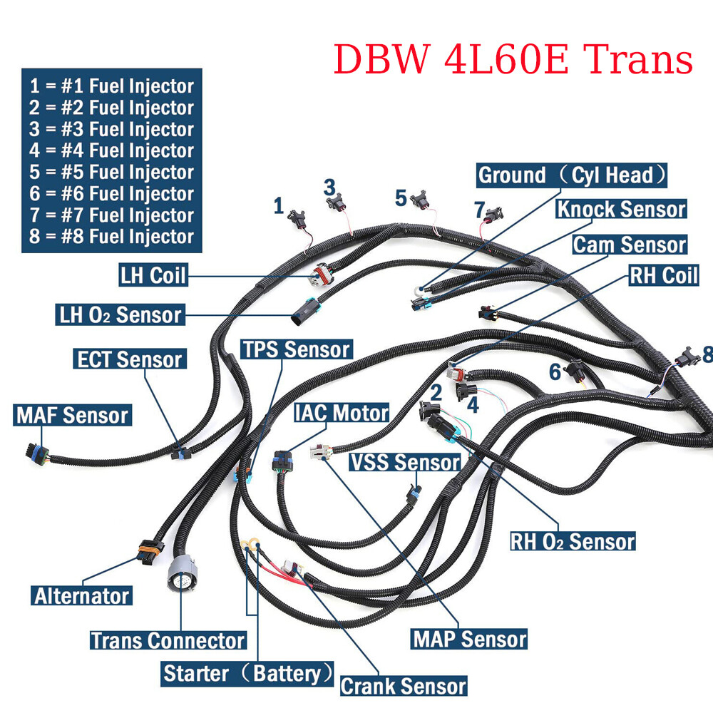 For 03-07 LS DBW Vortec Stand alone Wiring Harness 4L60E 4.8 5.3 6.0 Multec Wire Product View                                  Detail Key Features: 1\. All of our harnesses are built with OEM Quality and better 2\. All Harnesses have a High Quality Grommet installed on the Harness (THAT SLIDES FOR DESIRED MOUNTING) 3\. Harnesses receive a quality check before shipment. 4\. GM Color Codes. Many Companies Do NOT Use GM Color Codes. 5\. High Quality Reinforced Ring Terminals 6\. 1200 Degree Fiberglass Braid on All Circuits Ran by Heat 7\. All Factory CPA (Connector Position Assurance Locks) 8\. 18" ADDED LENGTH FOR EASY COMPUTER MOUNTING 9\. Harness comes with a complete install instruction packet. 10\. All harnesses come with the needed Dash Connections, which include Speedometer, Tachometer, Park Neutral, TCC, Malfunction Indicator, and a DLC Port. Compatible Models and Years: \- Fits 2003 - 2007 CHEVROLET, GMC, CADILLAC AND HUMMER TRUCK ENGINES (DRIVE BY WIRE ONLY) WITH 4L60E TRANSMISSIONS. Specifications: These harnesses are designed for retrofitting '03 - '07 Vortec engines (4.8, 5.3, 6.0-Liter) and 4L60E transmissions into older muscle cars and street rods or newer non-emissions controlled vehicles. Harness allows use of the factory Vortec intake manifold. They are completely plug and play with four wire hookup (switched power, constant power and ground connections required). Harnesses are designed with a sliding grommet seal and 4 - 5 feet of length from the rear of the cylinder head to the PCM mounting position under the vehicle dashboard. A sliding grommet seal allows for professional, leak proof installation. Harnesses are professionally constructed from Brand New GM Delphi Connectors and TXL (Polyethylene Cross Linked) High Temperature Wire to GM Specifications. All harnesses are Quality Inspected prior to shipping. Parcel Content: \- Complete Engine and Transmission Harness, Instruction Manual Note: The harnesses are for non-emissions equipped vehicles and do not include air pump or EGR provisions.         - Home - Payment - Shipping - About us - Contact us Product View                               Detail Key Features: 1\. All of our harnesses are built with OEM Quality and better 2\. All Harnesses have a High Quality Grommet installed on the Harness (THAT SLIDES FOR DESIRED MOUNTING) 3\. Harnesses receive a quality check before shipment. 4\. GM Color Codes. Many Companies Do NOT Use GM Color Codes. 5\. High Quality Reinforced Ring Terminals 6\. 1200 Degree Fiberglass Braid on All Circuits Ran by Heat 7\. All Factory CPA (Connector Position Assurance Locks) 8\. 18" ADDED LENGTH FOR EASY COMPUTER MOUNTING 9\. Harness comes with a complete install instruction packet. 10\. All harnesses come with the needed Dash Connections, which include Speedometer, Tachometer, Park Neutral, TCC, Malfunction Indicator, and a DLC Port. Compatible Models and Years: \- Fits 2003 - 2007 CHEVROLET, GMC, CADILLAC AND HUMMER TRUCK ENGINES (DRIVE BY WIRE ONLY) WITH 4L60E TRANSMISSIONS. Specifications: These harnesses are designed for retrofitting '03 - '07 Vortec engines (4.8, 5.3, 6.0-Liter) and 4L60E transmissions into older muscle cars and street rods or newer non-emissions controlled vehicles. Harness allows use of the factory Vortec intake manifold. They are completely plug and play with four wire hookup (switched power, constant power and ground connections required). Harnesses are designed with a sliding grommet seal and 4 - 5 feet of length from the rear of the cylinder head to the PCM mounting position under the vehicle dashboard. A sliding grommet seal allows for professional, leak proof installation. Harnesses are professionally constructed from Brand New GM Delphi Connectors and TXL (Polyethylene Cross Linked) High Temperature Wire to GM Specifications. All harnesses are Quality Inspected prior to shipping. Parcel Content: \- Complete Engine and Transmission Harness, Instruction Manual Note: The harnesses are for non-emissions equipped vehicles and do not include air pump or EGR provisions.         * * * On Aug 2, 2024 at 05:46:58 PDT, seller added the following information: