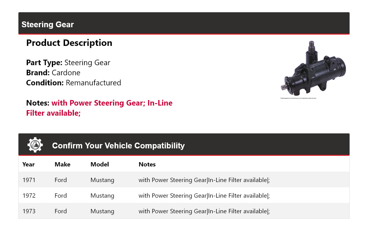 - Application: Ford Mustang Steering Gear