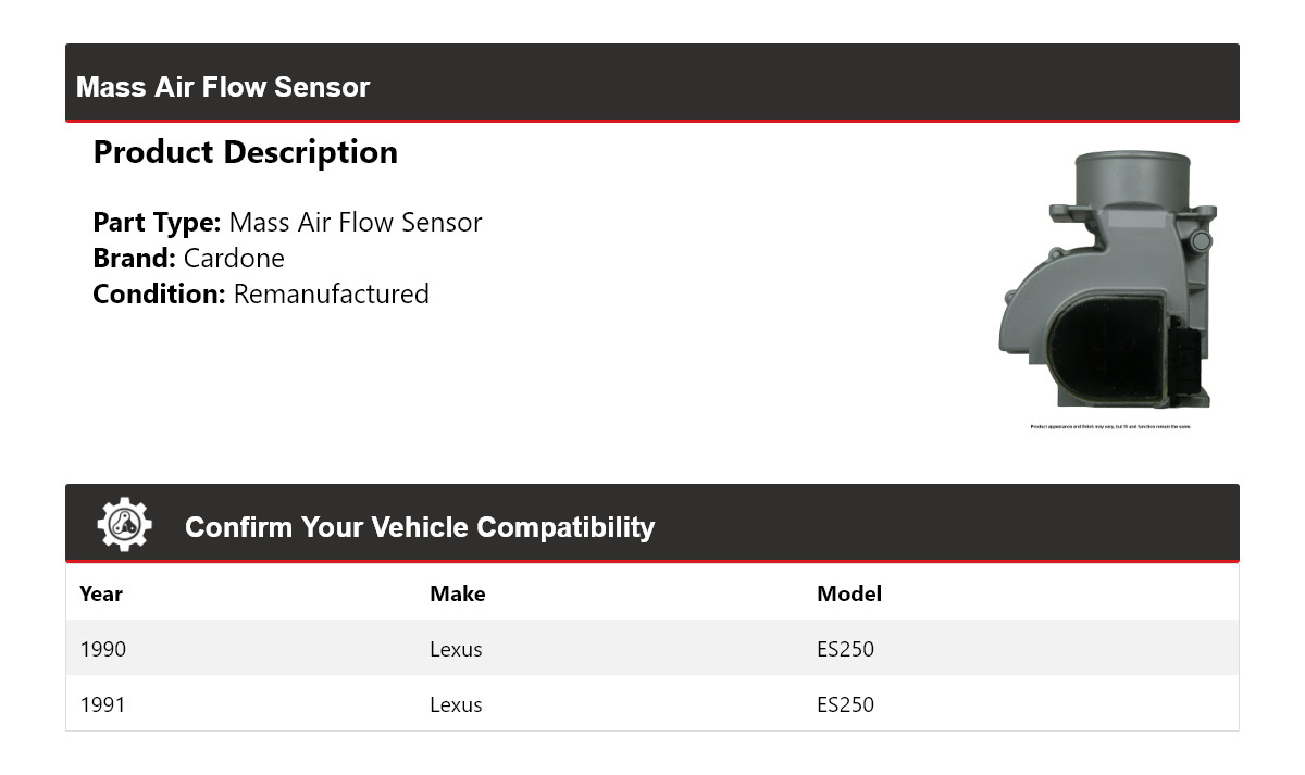 - Application: Lexus ES250 Mass Air Flow Sensor