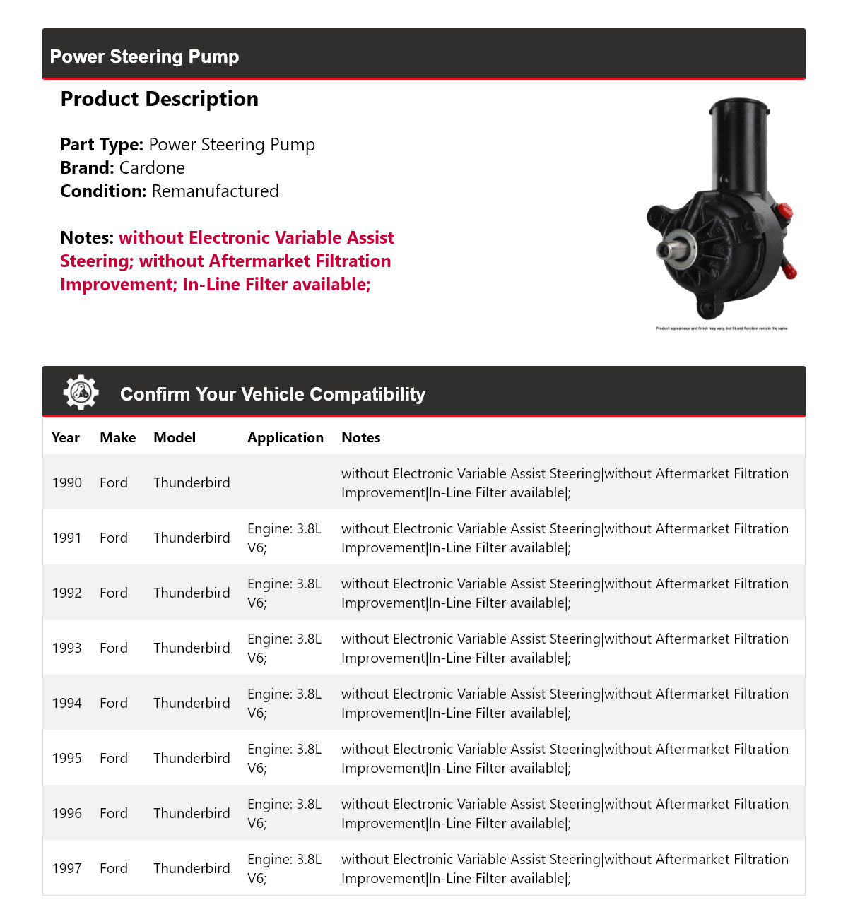 - Application: Ford Thunderbird Power Steering Pump