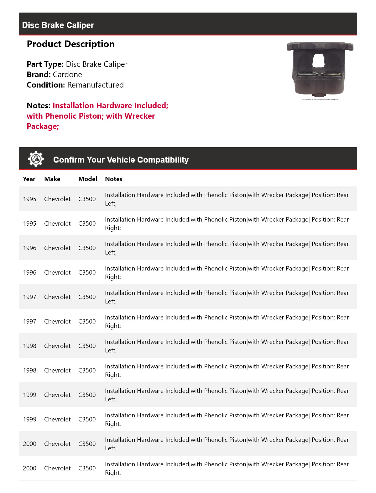 - Application: Chevrolet C3500 Disc Brake Caliper