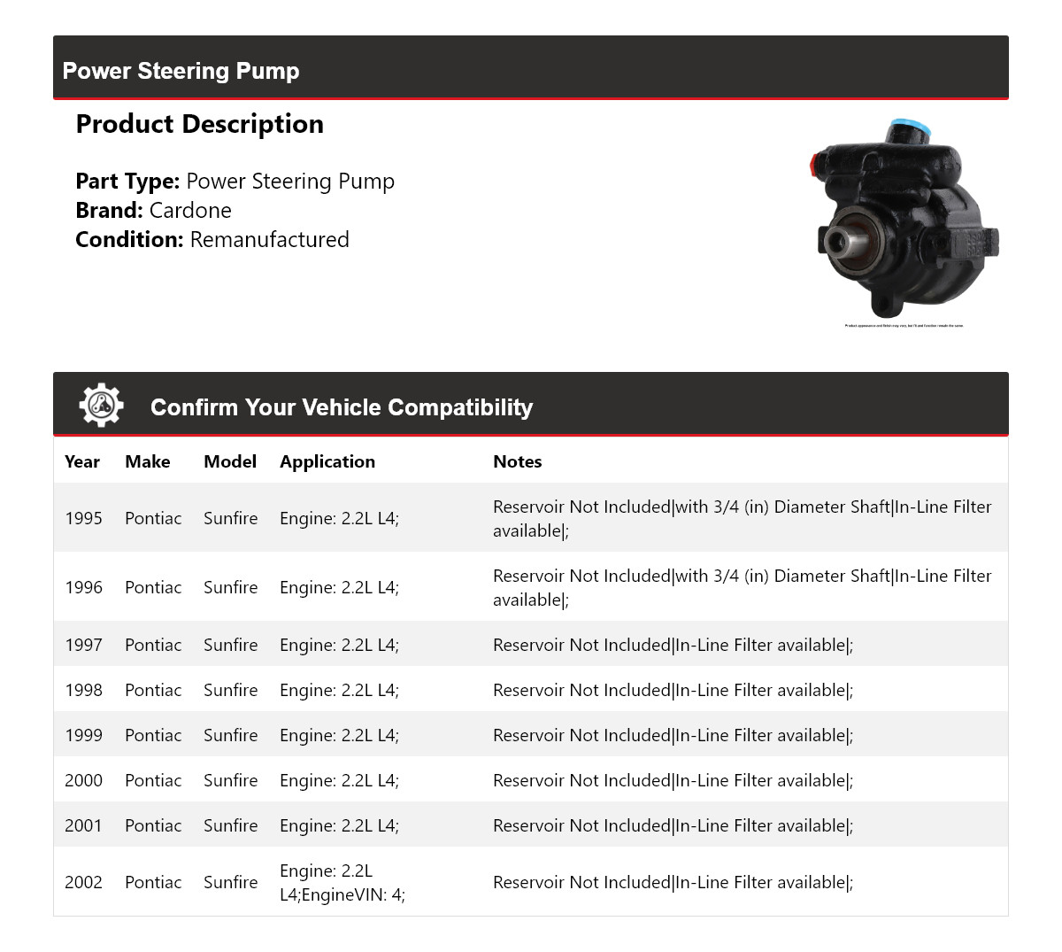 - Application: Pontiac Sunfire Power Steering Pump