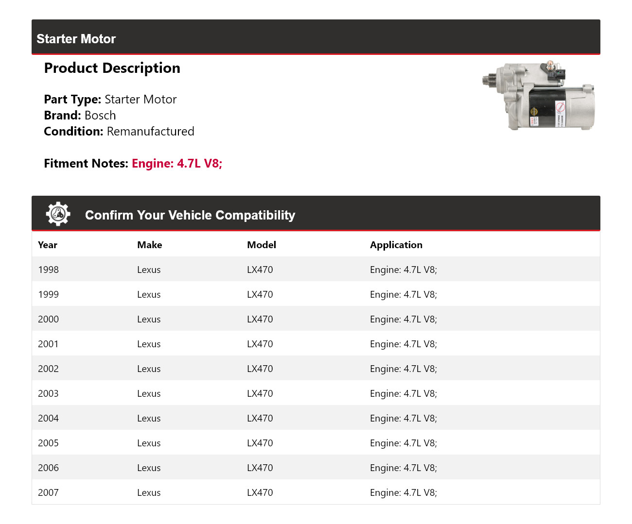 - Application: Lexus LX470 Starter Motor