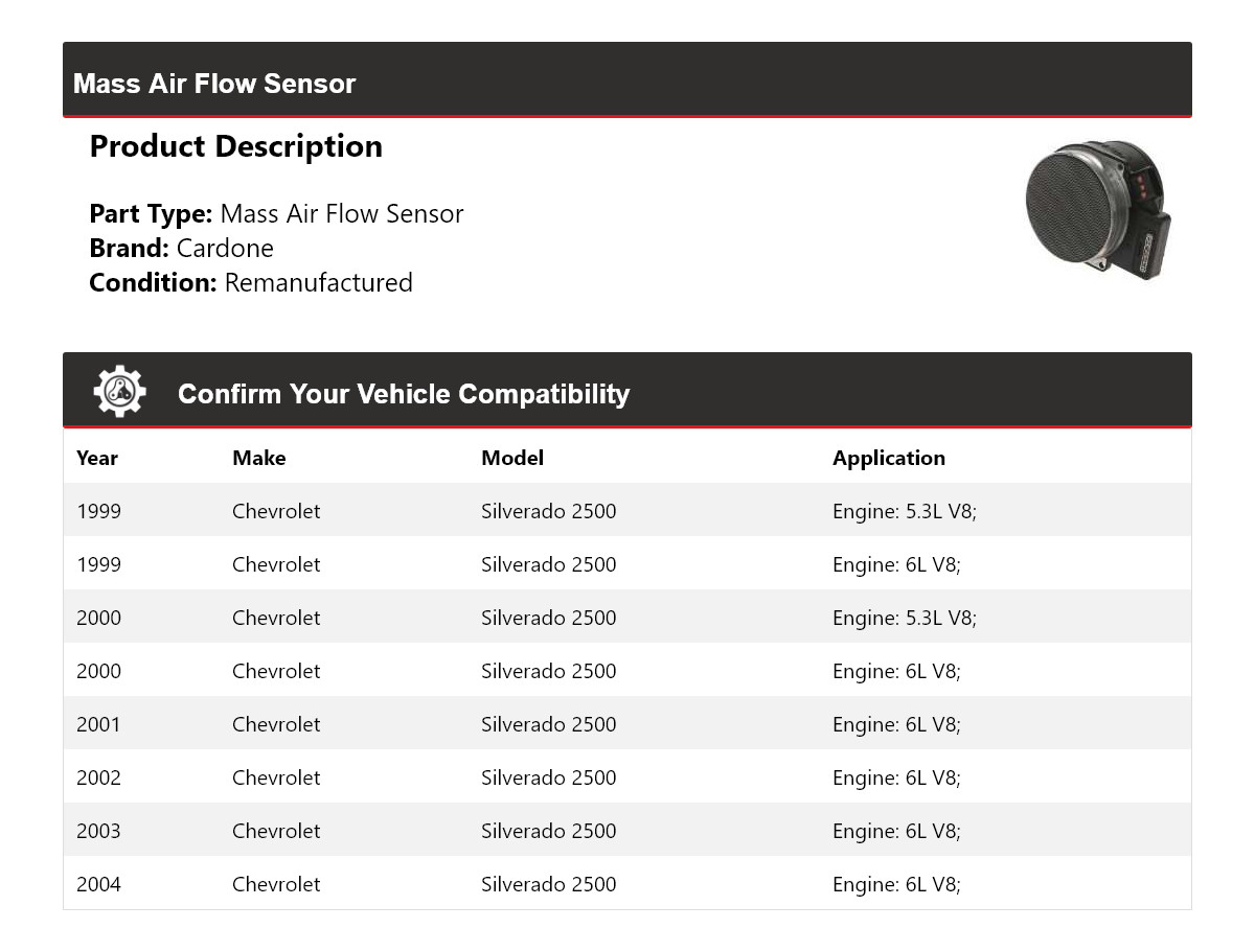 - Application: Chevrolet Silverado 2500 Mass Air Flow Sensor