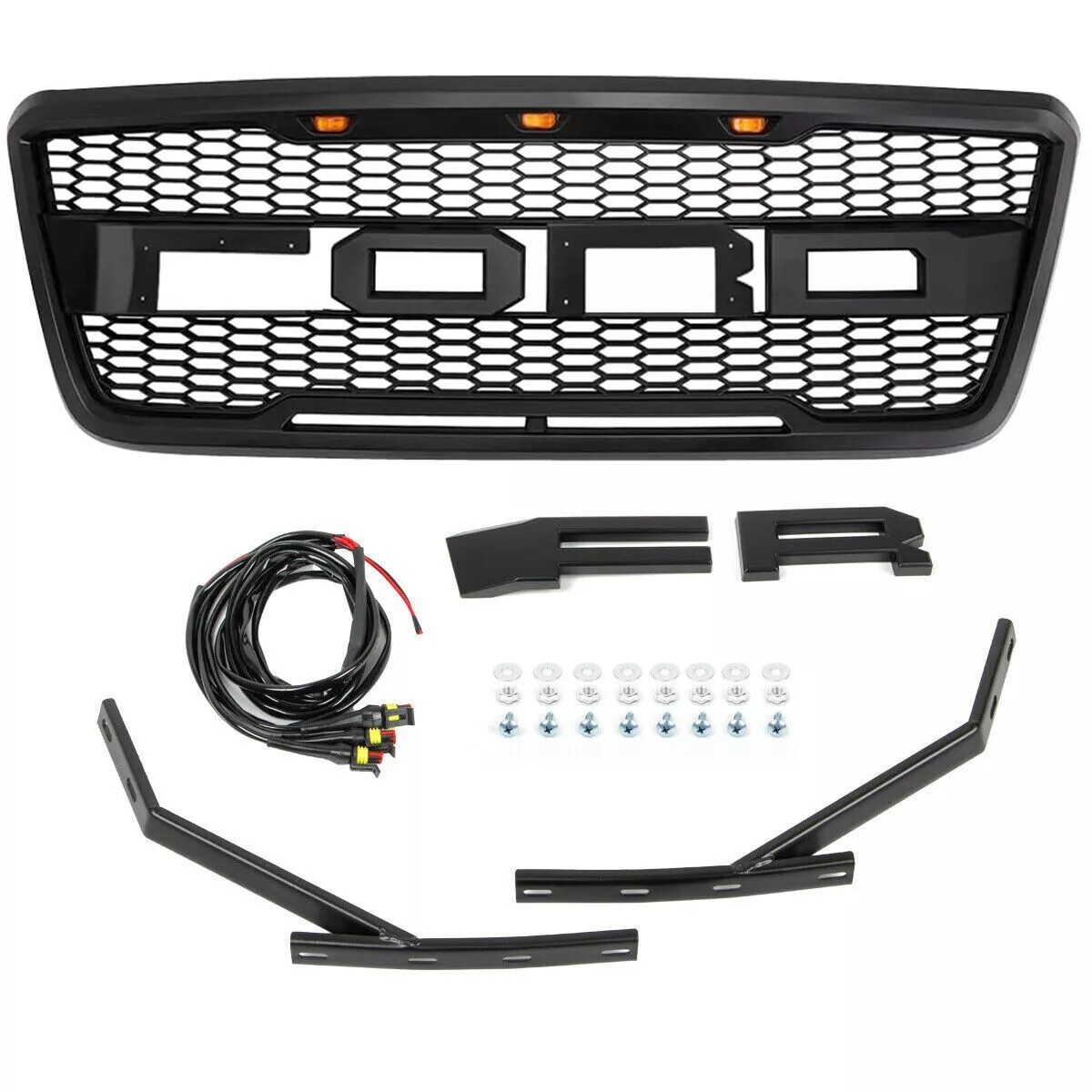 Specification: Style: Raptor Style Color: Matte Black Material: High Quality ABS Fitment: For 2004-2008 F-150 F150 Features: Direct bolt-on, Raptor style Grill fitment Made from high grade ABS materials to withstand rough road wear and the test of time. Light weight design.Gives your vehicle a new style and appearance. Accentuates your vehicles overall look. EASY INSTALLATION - Direct bolt-on replacement. Easy to install and replace the original front grill, No drilling required. Package Include: 1x Front Upper Grille with letters F&R (letters packaged and shipped separately) 3x Amber LED Lights 1x Wire Harness 2x Brackets PaymentDelivery detailsReturn policyAbout usContact us Payment We accept Paypal,Google Pay,VISA,Master Card,American Express and Discover. Delivery details We usually ship from US within 1-3 business days with tracking number. Return policy 30 days returns. Seller pays for return shipping.