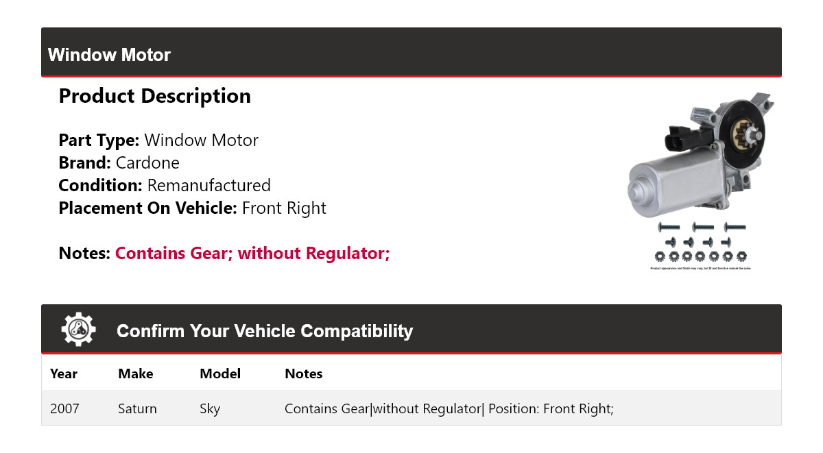 - Application: Saturn Sky Window Motor