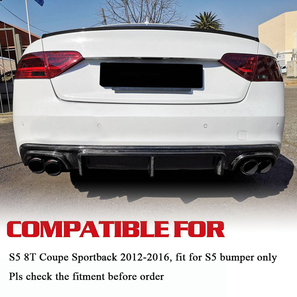 Features: 1.For Audi S5 Sedan 4-Door 2-Door/Base Convertible 2-Door/Base Convertible 4-Door/Base Coupe 2-Door/Base Coupe 4-Door/S5 Facelift 2012-2017 2\. made of high quality and light weight 3K carbon fiber, with polished and shinning surface and UV-Protected Clear Coating, high strength, impact resistance fade and rust resistant 3.Aggressive looking, more sporty 3.Replacment style, need to take off original bumper first. Carbon diffuser for Audi S5 **Features:** **1.For Audi S5 Sedan 4-Door 2-Door/Base Convertible 2-Door/Base Convertible 4-Door/Base Coupe 2-Door/Base Coupe 4-Door/S5 Facelift 2012-2017** 2.Made of high quality and light weight 3K carbon fiber, with polished and shinning surface and UV-Protected Clear Coating, high strength, impact resistance fade and rust resistant 3.Aggressive looking, more sporty, Impresses with its fitting accuracy and emphasizes the sporty lines of your car 3.Replacment style, need to take off original bumper first. Install with screws and snaps 4.CNC moulding for high quality product subversion traditional moulding to ensure high quality product 5.Excellent fitment, precision car datas was saved by scan technology 6.personalize and update your car, enhance the appearance of the vehicle, create a unique sporty line, gives a customized look **Specification:** Model: **S5 8T Coupe Sportback, fits for S5 bumper only** Years: 2012 2013 2014 2015 2016 Position: Rear Bumper Package Size: 157\*51\*21cm Package Weight:9kg **Package content** 1PC rear diffuser, Self-tapping screws **Installation** Easy to understand and install About Payment and taxAbout Return PolicyAbout shippingAbout usContact us About Payment and tax 1\. 2\. Please always contact us to resolve any problems, we will do our best to satisfy you. Thanks very much. 2.Please contact us first if you have any problems/questions/concerns. We will be happy to resolve any issues you may have in a cordial and friendly manner. 1\. Please contact us if we have not specified the shipping fee to your country. 2\. Package will be shipped from China,usually it will be delivered to most countries. 3\. If you want to upgrade the shipping,please contact us before making payment,we will revise the shipping fee. About us Our company is one of the earliest and leading auto parts manufacturer since 2002. We are endeavor to deliver the most cost-effective and standard auto tuning parts to global customers. With more than 15 years of experience in overseas business,we are specialized in designing,developing and producing CARBON FIBRE, PU, FRP car body parts, and interior and exterior trims for Germany & American & luxury super cars. Contact us 1.If you have any question, please feel free to email us. We will provide the best solution for you. We usually reply messages within 0-24 hours on business day. If you haven't got our reply on time, please don't worry, we will proceed it as soon as possible.