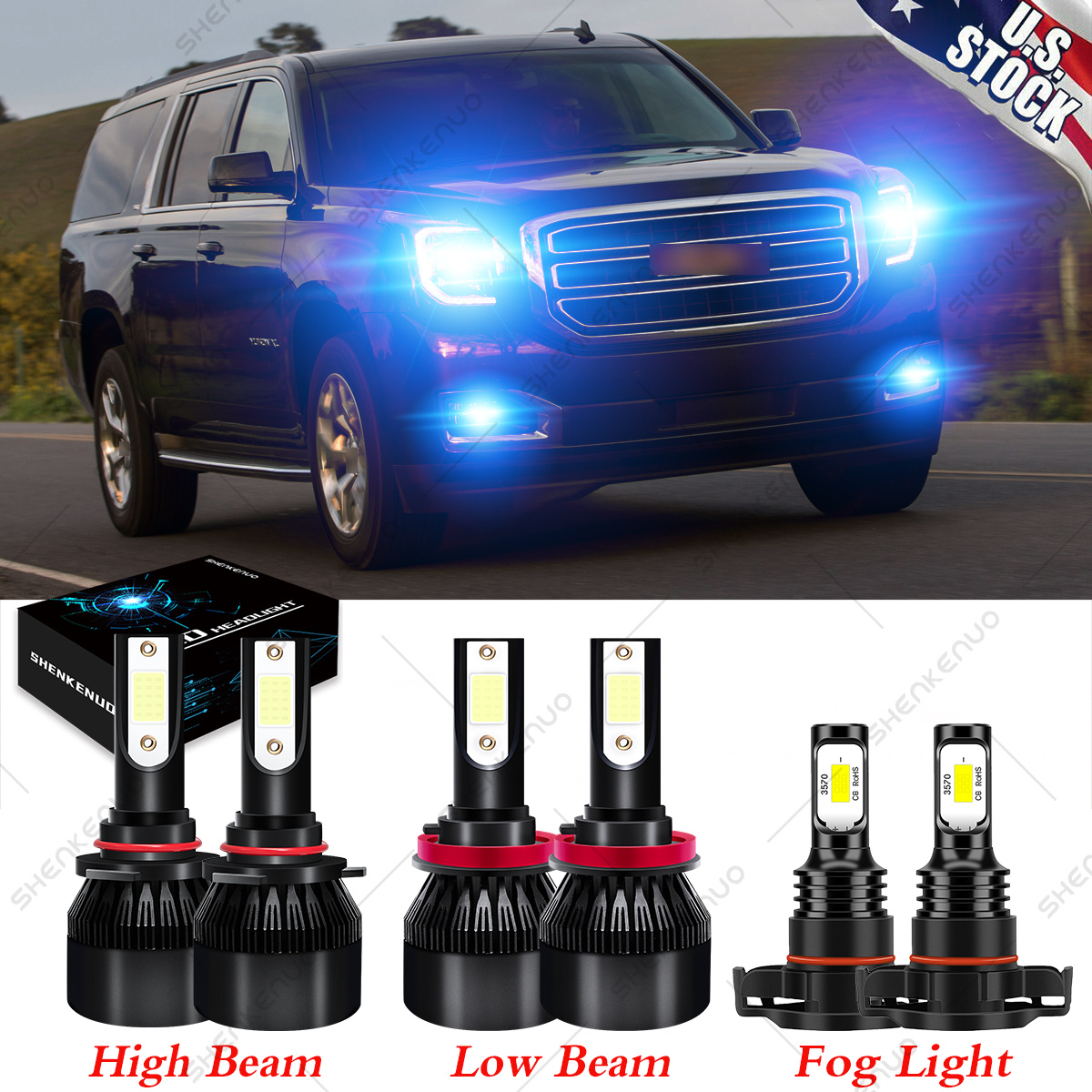 Got a question, need a return/exchange or recommendation on a product? Our customer service team is here to help! **OFFICE HOURS** Mon - Sat Sunday: Closed In our shop, you will find a large selection of high quality automotive accessories. Not only do we sell quality, affordable parts, but we also sell confidence. All purchase in our store will have 60-Day Money-Back Guarantee, please see our Policies. **Fast Shipping.**                                     * * * ****Note: package only include 6PC LED Bulbs**** ****NOTE:**** ****1\. Please double check local traffic rules before order, ice blue bulbs are illegal to use in some of the states.**** ****2\. If there is an error on the onboard computer after installed LED light bulb on a car, please install a resistor or capacitor to eliminate the error message. This product does not come with an external resistor or capacitor.**** ****3\. This kit is for vehicles with Factory Halogen Systems, it will not work with vehicles with Factory HID.**** **Specifications:** Plug Type: 9005 (High Beam) + H11 (Low Beam) + 5202/H16 (fog light) 1.Wattage:55W/Bulb 110W/Set 2.Lumens: 6000LM/Bulb 3.Shakeproof and Long lasting up to 60,000 Hours. 4.Color Temperature: 8000K Ice Blue 5.Voltage: DC 9-32V ( Fit 12V,24V Vehicle ) 6\. LED type: SHENKENUO COB Chips. 7.Built-in Fans & Ballasts , No Other Fans & Ballasts Required,Smart Efficient Cooling System Fast Heat Dissipation. 8.Low Voltage Protection, High Precision Constant Current driver Chip 9.Easy installation,Just Plug and Play. **Automotive LED Bulbs advantages:** 1\. LED lights than traditional halogen energy, more bright . High focus and max light output with a wider and farther lighting area, Safer Night Driving. 2\. Xenon lamp brightness and proximity , but the LED lights light up without delay, to enhance road safety. Instant start no strong currents impact , effectively protecting the car comes with a battery , improving battery life of more than 30%. 3\. Fast cooling , the appearance of the most advanced design , thermal structure ingenious and reasonable.Power driver with wide voltage constant current mode , the car can respond to a variety of voltage instability , the effective protection of normal use Led efficient and simple structure. 4\. Heating temperature is low , protect the car . Xenon working temperature up to 800 ° -1000 ° , the main reason for the car ignition 5\. LED car headlights simple structure, fewer parts than xenon lamps, significantly lower than the xenon lamp failure rates ! **Package Content:** 6X LED Bulb 1.Compatible List can not show up all Car model. Please check the Correct bulb size of your vechicle. 2.If you are unsure your bulb type, please do remember send message to tell us your car make, model, year and other information which is helpful to check bulb type.       - Payment - Shipping Policy - Warranty & Returns Policy - Feedback - LED Kits Troubleshooting Payment Instant PayPal payment is the preferred method of payment. We also accept payment via PayPal, DebitCard, Visa, MasterCard, Discover. We will only ship to the confirmed PayPal shipping address given with the payment. If you want to ship to other address, please change your PayPal shipping address before you make payment. To avoid initiating an unpaid item claim, please pay within 7 days.  Shipping Policy **NOTE:** We will ship item locally for US buyers. Usually for US buyers it will take about 5-7 business days to reach.(If it is due to special reasons, such as weather, etc... it may be extended, please forgive me) If you don't get it, please contact us firstly, we'll try our best to support you. For US customers, all items will be shipped out within 1-2 business day with cleared payment. Please included your phone number to the payment note for prompt and secure shipment. Warranty & Returns Policy Hassle Free Warranty 1) Disclaimer:Our warranty covers the replacement of the part only, DOSE NOT COVER any associated costs in regards to labor or any other expenses incurred or associated with the purchase of the part. 2) We offer a 60-day free return & money back guarantee. If you are not satisfied with your purchase for any reasons, you can return the item for refund or replacement/exchange. All returns must include the original packaging. (Please refer to our return policy for details.) We only warranty cost of parts. Any installation or other fees are non-refundable. 3) If you don't return goods within 30 days from date of purchase, your right to cancel will be revoked. Any items damaged because of incorrect installation will not be refunded. If a part arrives damaged, it is our responsibility to take care of it, but it must be reported to us immediately Feedback We always put our customers first and your satisfaction is guaranteed. If you have ANY issues with shipping, product or service, please Contact Us first before leaving feedback/write a review or filing a return case. We will solve the problem! Our SHENKENUO Tech's are here to serve you. Email us and our expert team will swiftly diagnose the issue and offer the best solution within 12-24 business hours. All off-hours emails will be answered the next business day. LED Kits Troubleshooting Q1: Can you tell me when my order will be shipped? A: All orders will be shipped within 1-2 business day. If your order was not shipped more than 3 business days, please contact us with your order number to get quick support. Q2: My item has not arrived, what's taking so long? A: Sometimes items take longer than expected, especially if it's going far or to rural area. Check with your post office to see if your item has been held up. Sometimes USPS will not update a tracking number until it has arrived at its destination. If your item still has not arrived after a few days, let us know so we can double check for you and help solve it asap. Q3: Do you ship to Canada, United Kingdom, Australia, etc.? Unfortunately, we could only ship to United States (Domestic ship