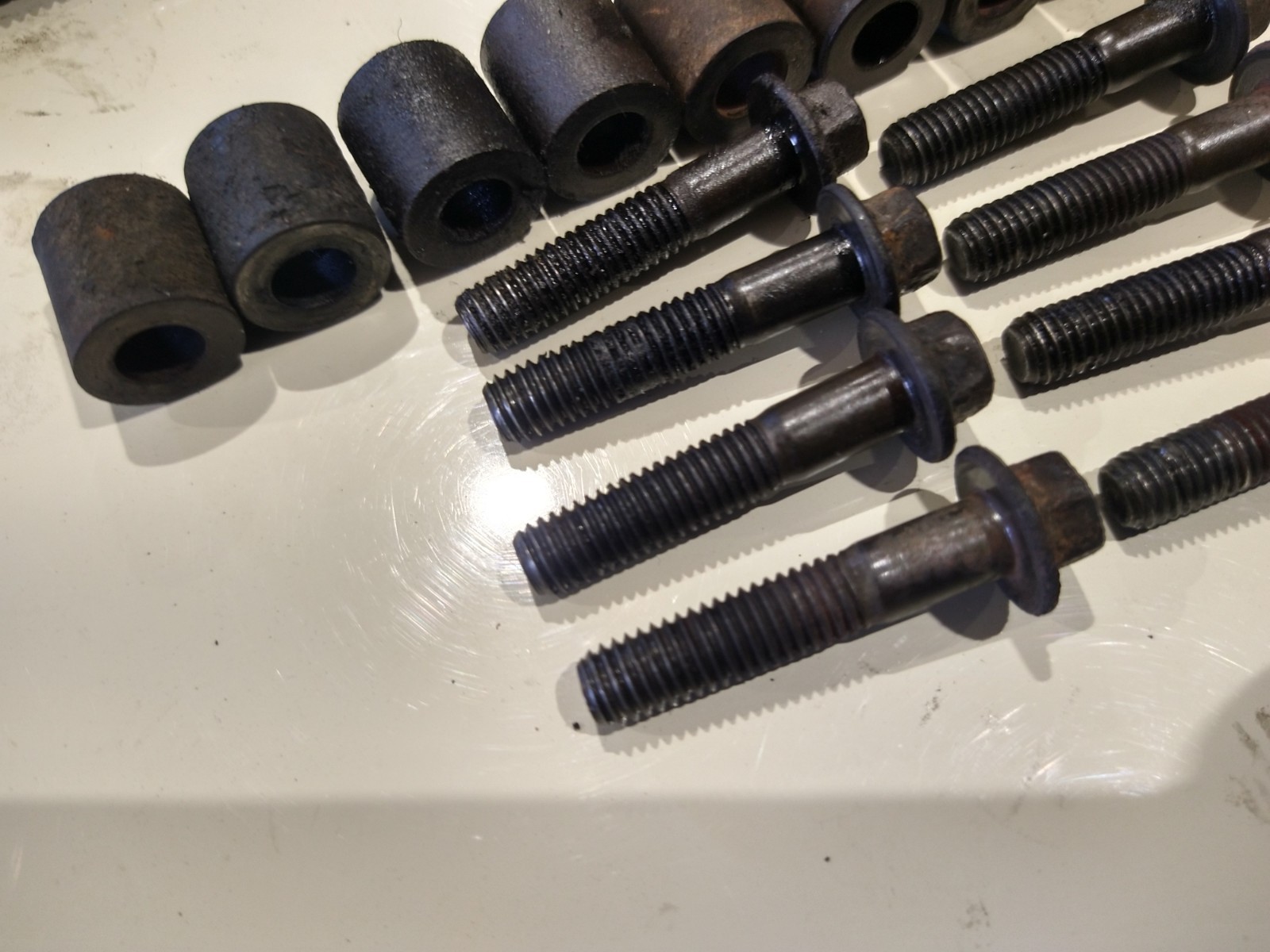 OEM set of 8 exhaust manifold bolts and spacers. No rust and good threads. For 2003-2007 F Series, 2003-2005 excursion and 2004-2010 E series.