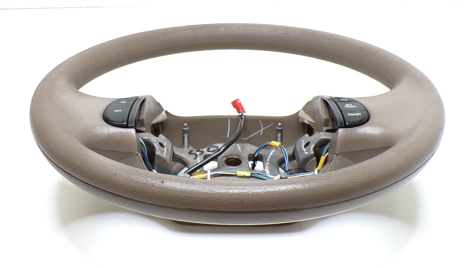 Tan steering wheel for 1999-2007 F250, F350 or Excursion. Has wear as pictured. Color and Condition as pictured. NOTE: this will only work for a truck with cruise buttons only(as pictured). Will not work in a truck with Cruise and Audio Buttons.