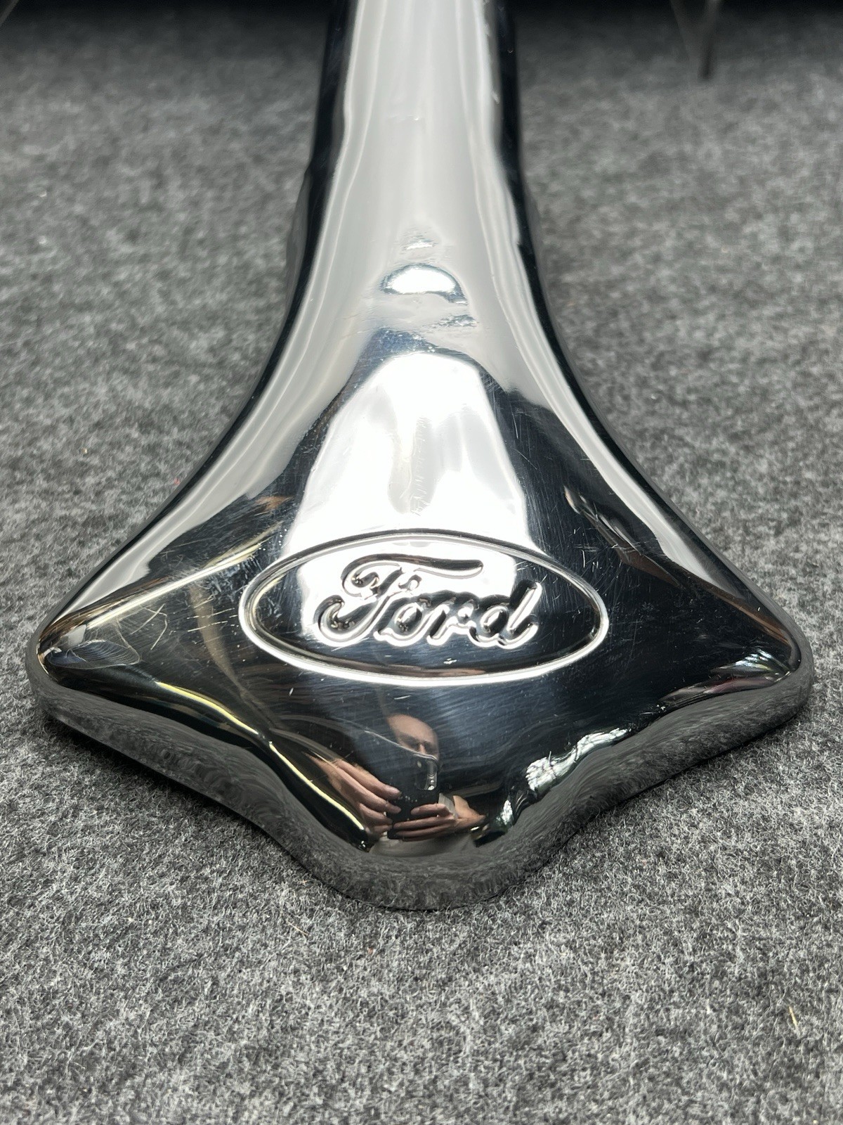 Ford Script Oval Exhaust Tip Deflector (Stainless Steel) Has been given a moderate buff/polish to polish out any light scratches and knock back any mild to moderate scratches. Some light scratches do remain along with a couple light dents in the center. 8-1/2" in length x 5-1/2" at its widest \- \- \- Please take a moment to look at all pictures and read the entire description... if you have any questions at all, do ask! I do combine shipping! Add items to cart, request for combined shipping and I'll send a revised invoice. Thanks!