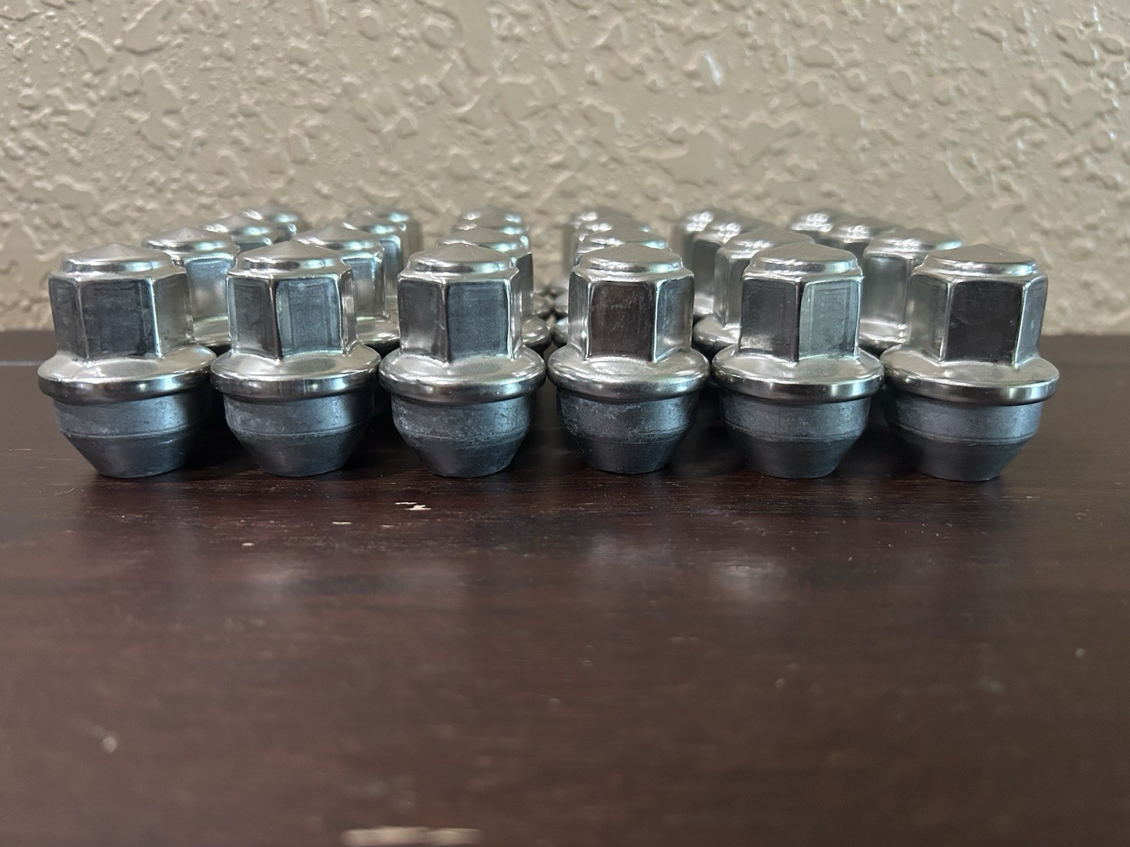 The product is a set of 24 Ford F150 stainless lug nuts, designed for models from 2015 to 2025. These lug nuts are factory OEM, made of steel with a polished stainless and chrome finish. They are easy to install and are suitable for placement on the rear, left, front, and right sides of the vehicle. Made in the United States, these lug nuts provide a secure and stylish option for your Ford F150. These lugs were removed off of brand new F150s.