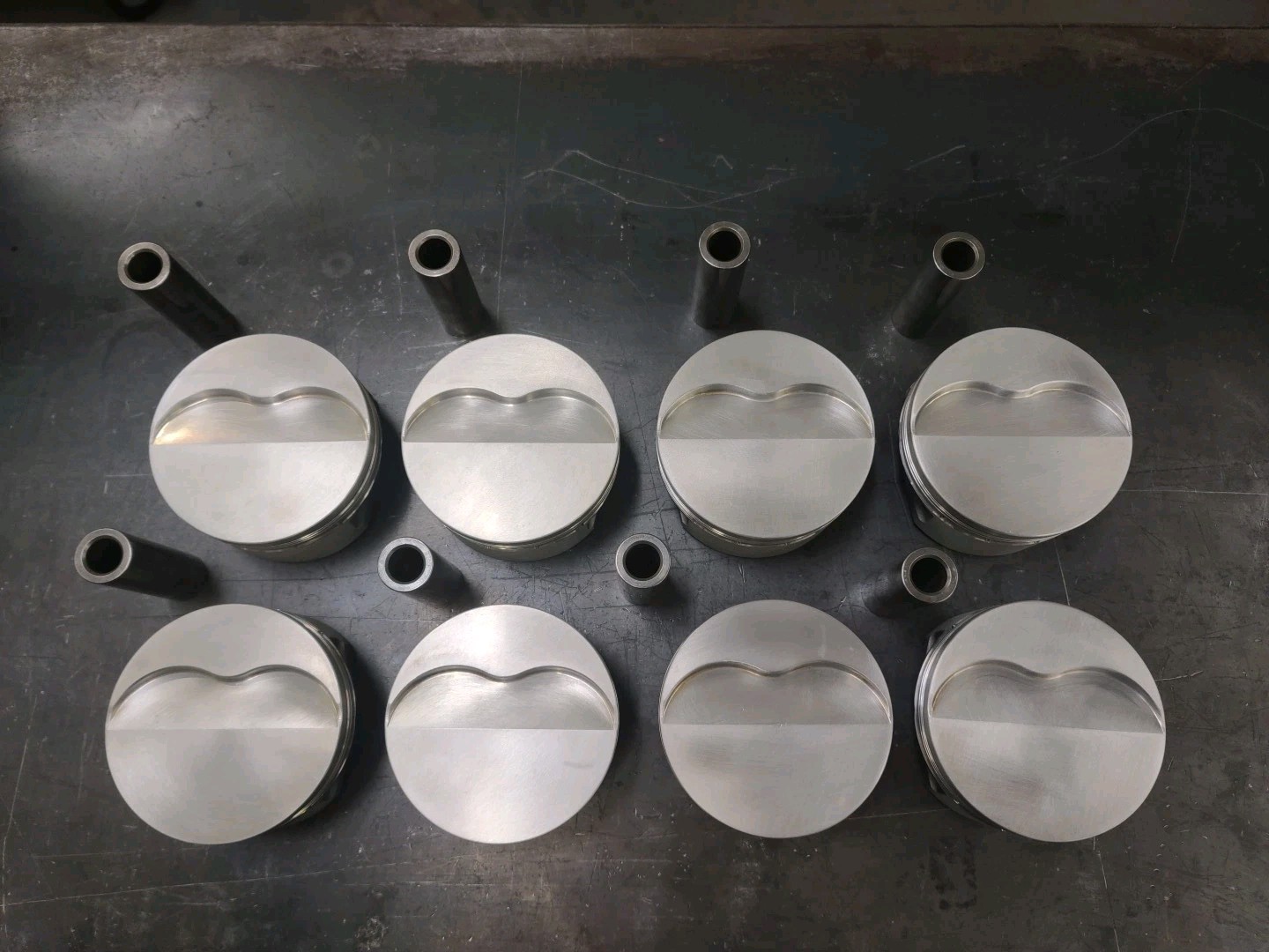 8 Ford FE 428 stroker Diamond Forged Pistons and pins. Flat tops. 4.170 .bore. 1.335 compression height. .990 pin. Use with 6.700 long rods and 4.250 stroke 464 CI. 1/16, 1/16, 3/16 ring grooves. Used in good condition! Piston weight 490 grams. Pin weight 175 grams.
