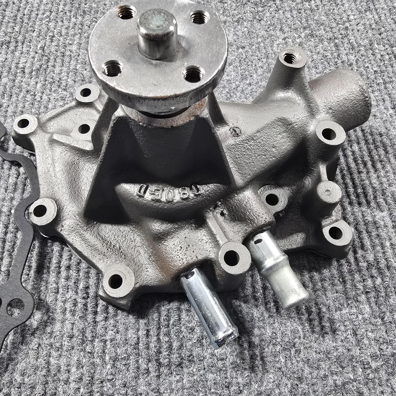 **Ford FoMoCo OEM Engine Water Pump Cast Iron with Gasket Pulley Hub 0806D Logo** **Shows wear with light surface rust at the pulley flange and oxidation visible on the internal impeller. Exterior appears cleaned and coated; minor scuffs and handling marks present. No cracks observed in housing. Includes gasket and installed heater hose tubes. Untested for operation; please verify compatibility and condition from photos.** **Item: OEM Ford FoMoCo engine water pump with included gasket and pulley hub.** **Brand/Markings: Cast-in FoMoCo logo on housing; casting code "0806D" visible on the body.** **Material/Finish: Cast iron housing with dark gray/black coated finish.** **Includes: Water pump, new gasket, and two installed heater hose nipples/tubes.** **Design/Features: Front pulley flange/hub, multiple mounting points, rear impeller cavity, and integrated coolant/heater ports.** **Color: Gray/black cast finish.** **Fitment: Specific vehicle/engine fitment not confirmed—please verify by comparing the casting code, port layout, bolt pattern, and photos to your application.** **Visible Text: FoMoCo logo; "0806D" casting code.** **Use: Suitable as an OEM-style replacement or for restoration where a FoMoCo-marked pump is desired.** **Notes: Review all photos for details and exact configuration before purchase.** **Thank you** for shopping with **Gamble Run Deals** — proudly **American owned and operated.** We take **pride** in providing **quality items** and **great service**. We offer **free returns** on nearly every item in our store; we want you to **love your purchase**! If there’s ever an **issue with your order**, please **contact us and we’ll make it right**. **📦 Fast Shipping:** Orders ship Monday through Friday, with same-day or next-day handling. 🤝 **Need something extra?** Message us for combined shipping, bulk deals, or any questions you may have. - ✨ Don’t forget to follow our store for exclusive coupons and special offers!