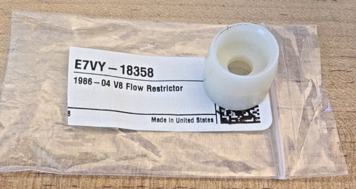 **Ford Heater Core Coolant "Flow Restrictor" Heater Core Protector - Fits 3/4" Hose** **Fits 79-04 Mustang models and more.** **_We are currently shipping the item shown in the first 4 photos. This is a substitute for the OEM Ford black version which is on back order. Install and use it the same way by inserting it inside the heater core inlet side hose. The dimensions on this part is 3/4" diameter x 5/8" length. Ford charges more than $23 for this part._** **_Take a look at some of the new diagrams we have uploaded showing where this part is normally installed. It is a great part to add to your cooling system to provide some additional insurance against heater core over-pressurization, reducing the chances of heater core being damaged during high-rpm engine operation._** **_Details_** Originally used on police cars & 1993 Cobras to reduce volume and pressure to prevent heater core blow outs and leaks. Recommended for all 1979-93 V8’s to reduce heater core leaks because core replacement is a big job. Easily fits inside the heater core hose.  **Mustang Heater Core Flow Restrictor** The heater core flow restrictor is an important part of the replacement of your heater supply hose and heater core on your 1979-2004 Mustang. This part helps reduce the risk of your heater core failing. The flow restrictor's job is to decrease the pressure of the coolant that flows into the heater core. It installs in the 3/4" heater supply hose in all applications. On the heater core side of the hose, slide the tapered end of the restrictor in first. No extra clamps are required for installation. This heater hose restrictor is original equipment for 1996-04 Mustangs, but can also be used on 1979-95 Mustangs as well. **_We have a few in stock! Please Read All Details Below Before You Make Your Purchase._** **_Contact me with any questions prior to purchasing. Look at the pictures to see where it's installed._** _**UPDATE:**_ _In stock and ready to ship but last one for a while!_ _More also on the way._ _Everything below is left for reference purposes. You can read about the original restrictor_ _An easy to install inline restrictor that you insert into your factory or aftermarket heater hose at the the heater core inlet tube junction. See notes below on recommended hose sizes and overview of best way to use this if you originally did not have one from the factory. This is made with the original Ford tooling. It is made from a high density, high temperature polymer & will provide many years of care free service. I have taken pictures of the original part out removed from packaging for reference. Please read all notes & details below on the use, fitment and potential provisions or modifications necessary to properly use this part in your vehicle if you originally did not have one installed. Most of the time all that is needed is to insert this into the hose bringing coolant to the heater core then reattach the hose._ _**LOOK>**_ _**Question: What size heater hose does this restrictor fit best?**_ _**This restrictor fits a 3/4" heater hose the best!** >>> **You "may" be able to get it to work with a 5/8" heater hose but it will be quite a bit of effort. >>> for best results use this part with a 3/4" hose.**_ _For 5/8" hose, this may entail heating the hose to stretch it a bit while inserting the restrictor. Slight provision may be necessary if your 5/8" hose is stiff. Contact me prior to your purchase if you need help or have any questions._ _Again, to reiterate, you are much better off using this part with 3/4" heater hose._ **_Question: where should this part be installed?_** _**Answer:** This restrictor is recommended to be inserted inside the hose at the inlet side of the heater core. On most V8 ford small blocks this is the inboard side (toward the middle of the car) heater core port. It was recommended to install in the hose close to the connection at the heater core. Ford has released a bulletin at some point with a revision and recommending to install the restrictor in the same hose but closer to the connection at the manifold, about an inch back. Also use a hose clamp on the hose to keep the restrictor in-place. This is the same hose, just the opposite end. I have uploaded some pictures from that bulletin that shows the new recommended location. Either way, at either position this part will still protect the heater core, so just use your best judgement and insert it in the location that works best. I am just including the information to help you decide._ _From the web:_ Original heater core inlet restrictor Ford P/N E7VH-18D406-AA 1.25" from the engine. Note that this is the updated location from close mounting to the heater core tube. The restrictor shall be oriented such that the beveled edge faces the front of the car and its location secured with a hose clamp. That part is no longer available but the part in this listing can be used as a substitute. _**availability: we are down to our last few ? New shipment from Ford shortly (few days).**_ _WE CURRENTLY HAVE ( **3**) IN STOCK RIGHT NOW WITH_ __SOME MORE ON THE WAY IN (5+) DAYS._ PICKUP ONE NOW AND IT WILL BE SHIPPED OUT AS QUICKLY AS POSSIBLE> CONTACT ME FOR MORE INFORMATION IF YOU NEED ASSISTANCE>_ _**Note:** **Be aware that you may need to make minor modifications to properly & safely install this restrictor if your vehicle did not come with this type of part from the factory.** To date the only thing that we have heard is that if the short hoses that go from the heater core inlet tube to the metal tube that attaches to the manifold or that brings the coolant back to the water pump are damaged or stiff from age. Sometimes those hoses may have been shortened or damaged. You need to insert this restrictor into the hose attaching to the heater core inlet tube. If your hose is too short or has too much of a bend you may need to modify the hose or replace the hose. This restrictor goes into the hose! It is a good idea to replace older heat hoses as th