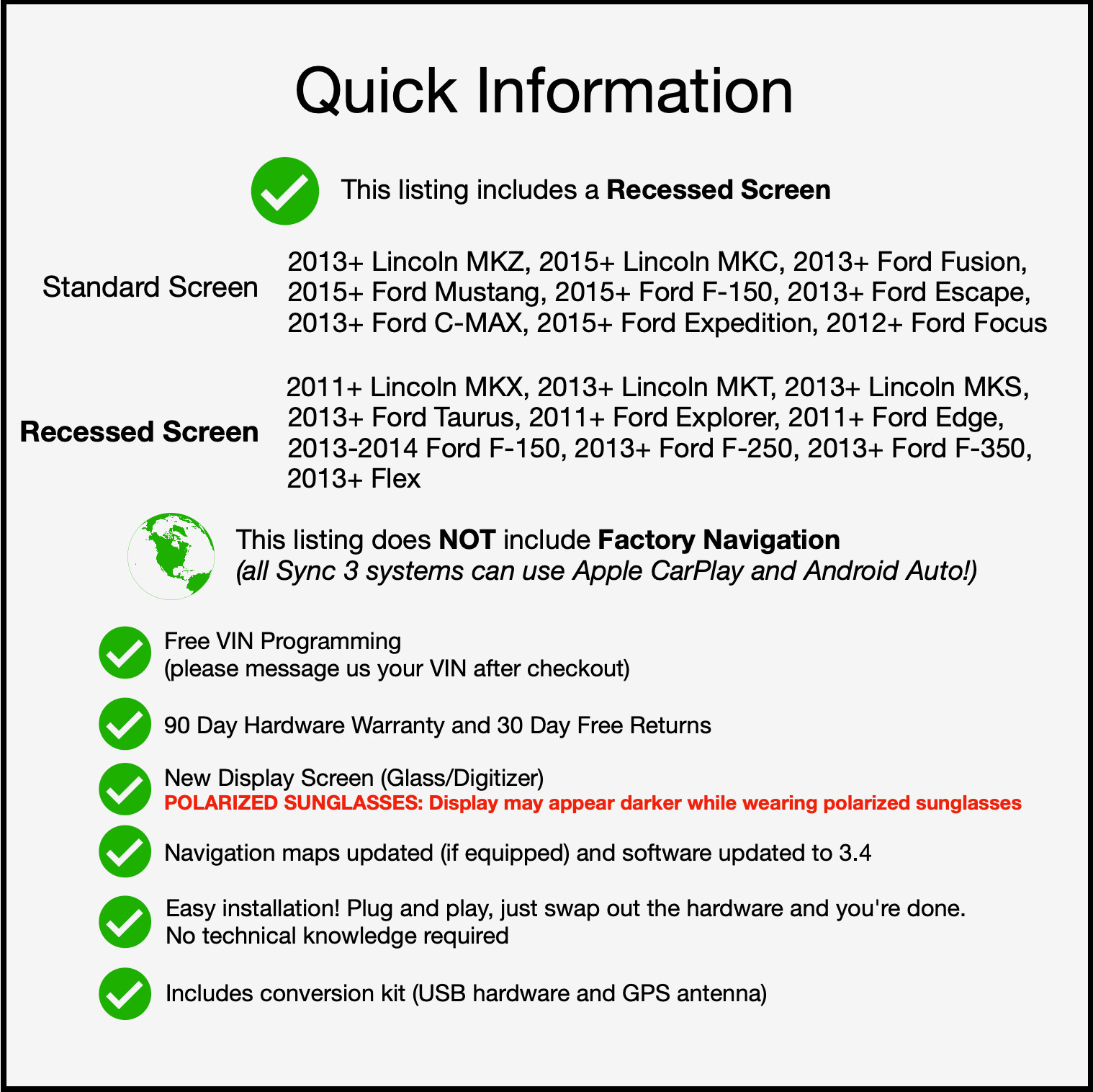 #   - **Enjoy the use of Sync 3 which includes features like Apple CarPlay and Andorid Auto. Use apps like Google Maps, Apple Maps, Waze and more with this plug and play kit from SimplyMichigan for your Ford/Lincoln vehicle** - All of our hardware is fully functional and tested, condition is used/seller refurbished - Does NOT include factory navigation - Includes **everything** needed to convert your vehicle to Sync 3 - Recessed display screen, digitzer is in new condition - **VIN Programming is included** - Fully updated to the latest 3.4 software - Easy installation! Plug and play, swap out the hardware and you're done. No technical knowledge required. No extra programming. - **30 day free returns, 90 day warranty on all hardware** - Stock photos were used for this listing ## Additional Information * * * Please read this listing in its entirety before purchasing to ensure your vehicle is compatible. Most of the questions that we get asked are answered here. - **Programming Instructions:** This purchase is only intended for Sync 2 (MyFordTouch) to Sync 3 conversions with the 8" display. We charge an additional $59 for orders intended for 4" to 8" conversions. Please include your vehicles VIN in the checkout notes or send it to us via message. If we do not recieve your VIN within 12 hours after purchase we may cancel your order. - **Hardware:** You will recieve hardware from a 2017 or 2018 vehicle, we do not use hardware from 2016 vehicles which have known reliability issues. The screen type for this listing is RECESSED which will not work on some vehicles. Please see the fitment section below to check compatibility. Every module will be updated to software version 3.4 with 2020 maps unless specifically asked to keep it at version 3.0 - **Package Includes:**This listing is for everything needed to convert to Sync 3, which includes the Screen and APIM module, USB hub, GPS antenna, USB hub bezel, USB hub harness, plastic prying tools and universal instructions ## Typical Applications * * * - **Sync 2 to Sync 3 Conversions:** These conversions are extremely easy to accomplish, even for a mechanical novice. We make them very straight forward, to the point you where you just need to swap the hardware out and you're done. You will need a screen and APIM bundle (this listing - check screen compatibility) and one of our conversion kits which include everything you need to change out your USB hub for one that is Apple CarPlay and Andorid Auto compatible and they also include a new replacement GPS antenna. Your exisiting GPS antenna is unfortunately not compatible. Your infotainment system will come pre-programmed. - **4" to 8" Conversions:** These conversions are more work but still completely fine to do. These conversions require quite a few more parts to complete; they typically require a new 8" HVAC bezel, conversion harness, screen brackets, USB hub, GPS antenna and USB extension cable. Depending on your vehicle you may require more/less parts. We do not stock all of the parts needed for these conversions, you would have to source them from other vendors. This all is more work but typically you will save money compared to the convenient pre-built kits. SimplyMichigan has started stocking some complete pre-built conversion kits for certain vehicles. - **Complete Screen/APIM Replacements:** Typically you wouldn't need to replace both the APIM and the display at the same time, if you're experiencing a black screen it's likely you will just need a APIM replacement. We do have APIM replacements available for sale in a different listing. If you do need an entire replacement, this listing (check screen compatibility) is all you would need. ## Conversion Kits (included!) * * *  Everything needed to convert your Sync 2/MyFordTouch vehicle is located in the box, including the conversion kit! (USB hub, USB hub bezel, USB hub harness and the GPS antenna). Don't need these items? Please send us a message and we can send you a special coupon to reduce the cost of this item by $100 and we will not include these parts. ## Vehicle/Screen Compatibility * * * Unsure what screen type your vehicle has? No problem! Use the guide below to see if your vehicle has a standard screen or a recessed screen. Have questions? Please don't hesisate to ask us for help. **Standard Display Vehicles** 2013+ MKZ2015+ MKC2013+ Fusion2015+ Mustang2015+ F-1502013+ Escape2013+ C-MAX2015+ Expedition2012+ Focus **Recessed Screen Vehicles** _(THIS LISTING)_ 2011+ MKX2013+ MKT2013+ MKS2013+ Taurus2011+ Explorer2011+ Edge2013-2014 F-1502013+ F-2502013+ F-3502013+ Flex **Looking for a standard screen bundle?** We have you covered. There's a $59 charge for 4" to 8" conversions. For this region we recommend purchasing a non-navigation infotainment system. If you're determined to get a navigation system, you can use a 3rd party tool to only install the maps you need. - **Are there any issues with steering wheel controls or the back up camera?** No, none of those will be effected. - **Do non-navigation systems still need a replacement GPS antenna?** Yes, non-navigation systems still use the GPS for compass control. - **Are there any issues converting Lincoln vehicles?** With some older Lincoln vehicles you may have to trim your stock screen brackets to clear the repositioned yellow screen connector. - **Do you sell modules from 2016?** We don't offer APIM's from 2016 donor vehicles; the 4 biggest APIM model numbers that you typically see are GXXX-14G370-BM, GXXX-14G370-BL, GXXX-14G370-CM and GXXX-14G370-CL. These are generation1 modules and have a higher failure rate that Ford is aware of and fixed in later generations. - **Do I really need a new dislay? Mine is perfect** Yes, older screens use a different technology and a totally different connector. - **My vehicle has an instrument cluster display in the dash (on the sides of the speedometer) of the vehicle which displays road names, speed limits, etc. Will this feature be retained when upgr