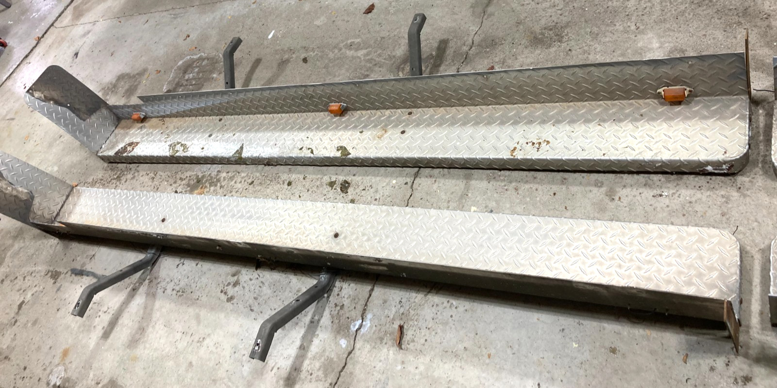 Removed from a 1987 Ford F350 Crew Cab, full four door pickup with an 8ft. bed. Four pieces. These are not for a dually. May fit other years and models of Crew Cabs from 1987 - 1997 F150 F250 F350. Please double check your measurements to the running boards as shown in the photos. Ask for more information or measurements if needed. We cannot take returns. Five marker lights per side. Lights have not been tested. Good overall used condition, no damage. Cleaning and polishing required. Additional mounting hardware is not included. The last two photos are for illustration purposes only and are not of the actual pieces you will receive. Ford Truck Diamond Plate Running Boards 1987 Crew Cab Four Door With Marker Lights Local pickup only near Rochester, NY 14580 Offers Welcomed. The Ford Truck Diamond Plate Running Boards with marker lights are designed specifically for 1987 Crew Cab four-door trucks. Made of durable aluminum, these running boards add a sleek and rugged look to your vehicle while providing a sturdy step for easy entry and exit. The set includes four pieces, ensuring a perfect fit for your Ford F350 and F250. With marker lights added for added visibility, these running boards are a must-have accessory for any Ford truck owner looking to enhance their vehicle's exterior and functionality.