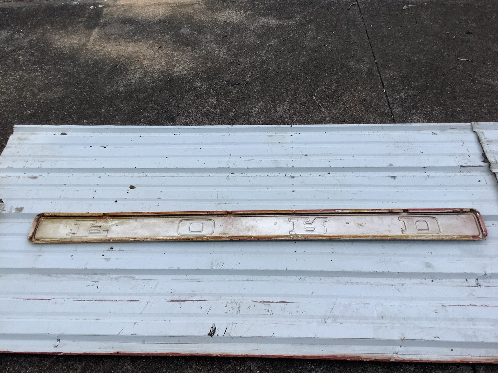 FORD Tailgate Logo. Came off a 1971 F100 SportCustom Truck. In very nice condition. No dents or dings. A few spots on the black paint needs touch up and there is some yellowing on the sides and some red overspray on the bottom and back. A very hard to find part in Original Condition Will also fit other Ford Truck Taillights.